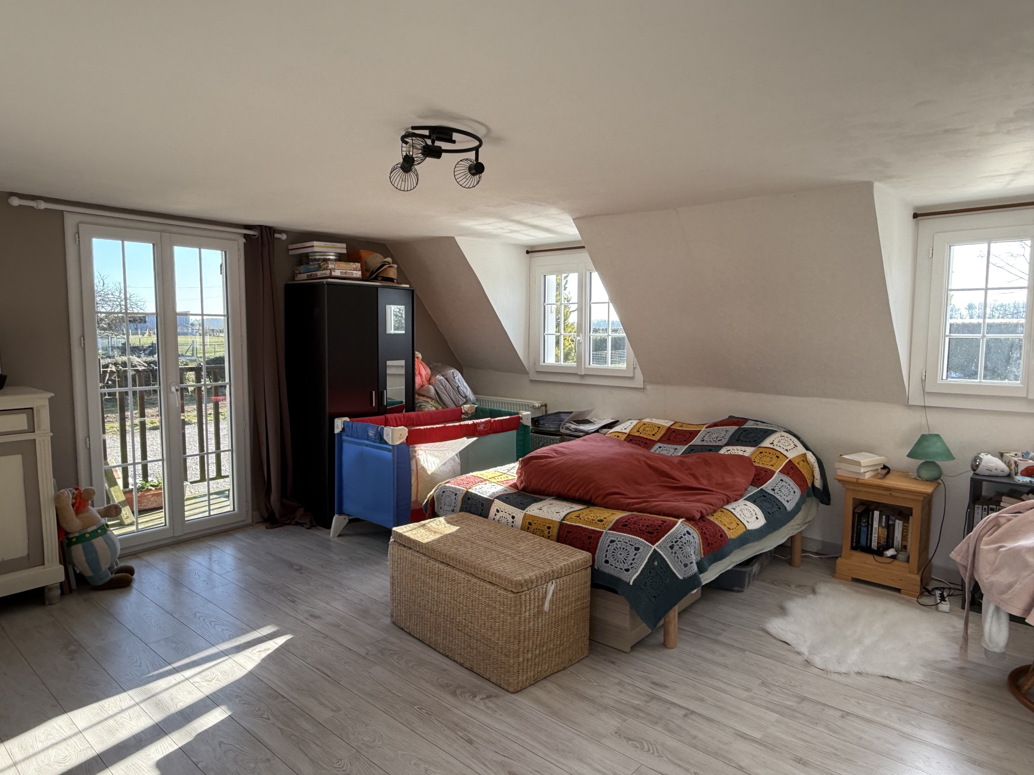 - Au rez-de-chaussée : entrée, cuisine aménagée, séjour, 2 chambres, salle de douche et wc.