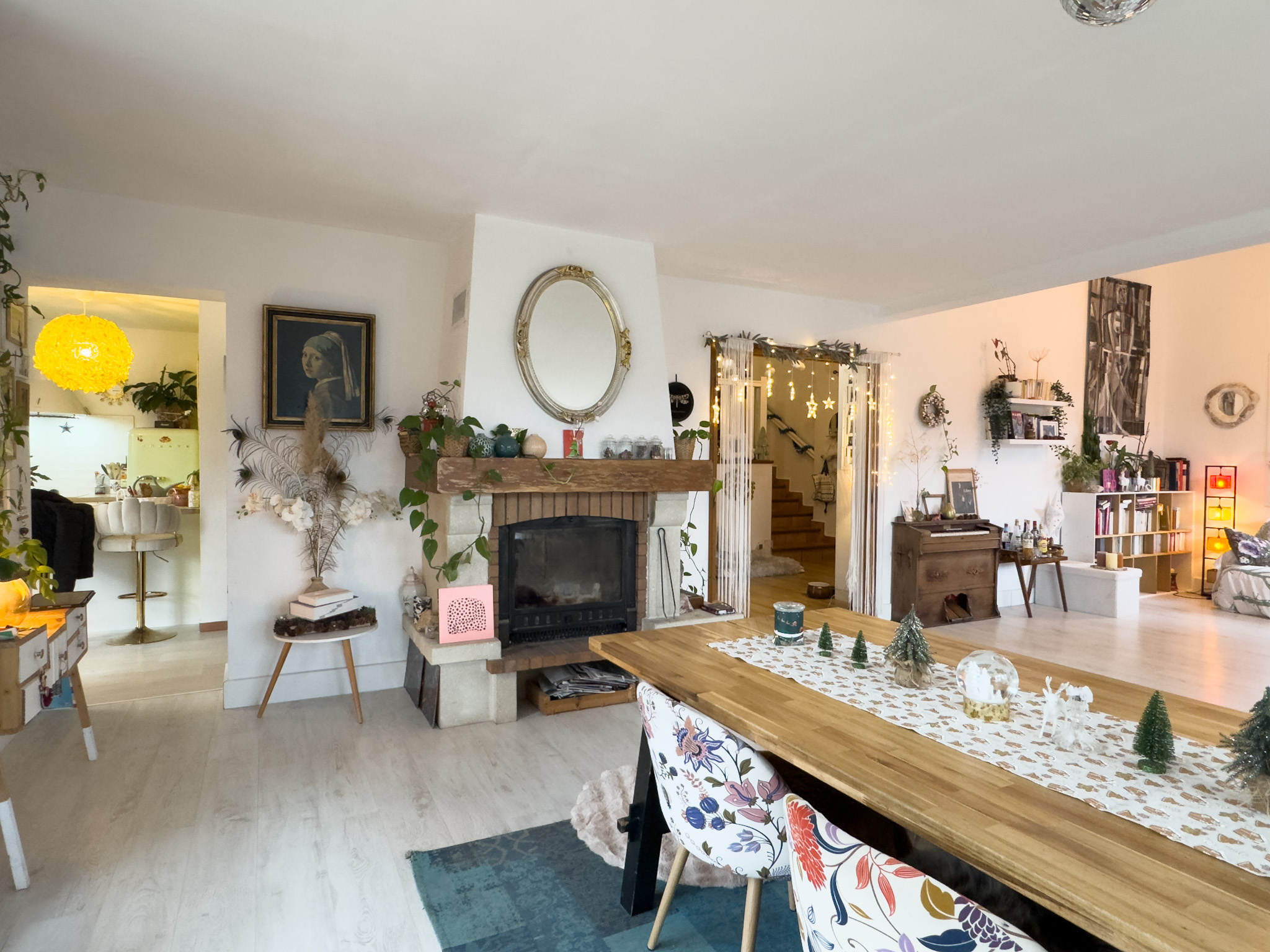 Le séjour spacieux d'environ 47m2, équipé d'une cheminée insert, s'ouvre largement sur les extérieurs et offre une atmosphère chaleureuse et conviviale.