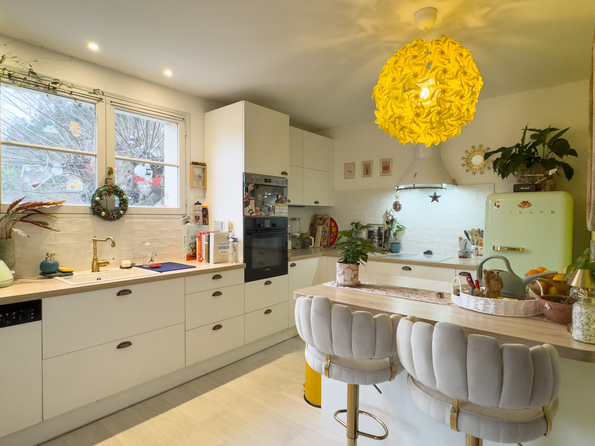 La cuisine récente de 12m2, est entièrement équipée et donne un accès direct à une terrasse panoramique idéale pour profiter du cadre environnant.