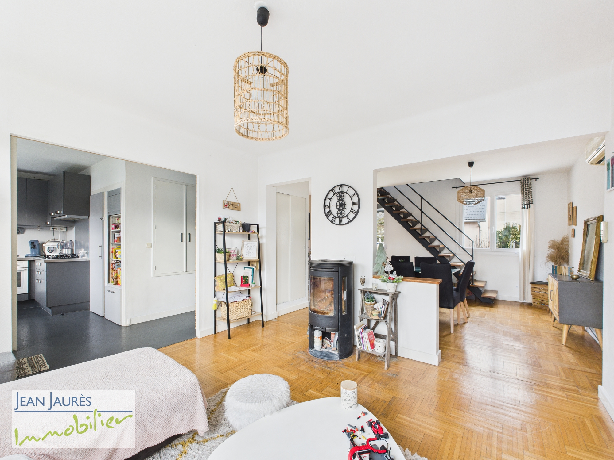 Le rez de chaussée est composé d'une cuisine indépendante aménagée équipée, salon séjour traverssant baigné de lumière avec son poele à bois, 2 chambres, salle de bain avec wc.