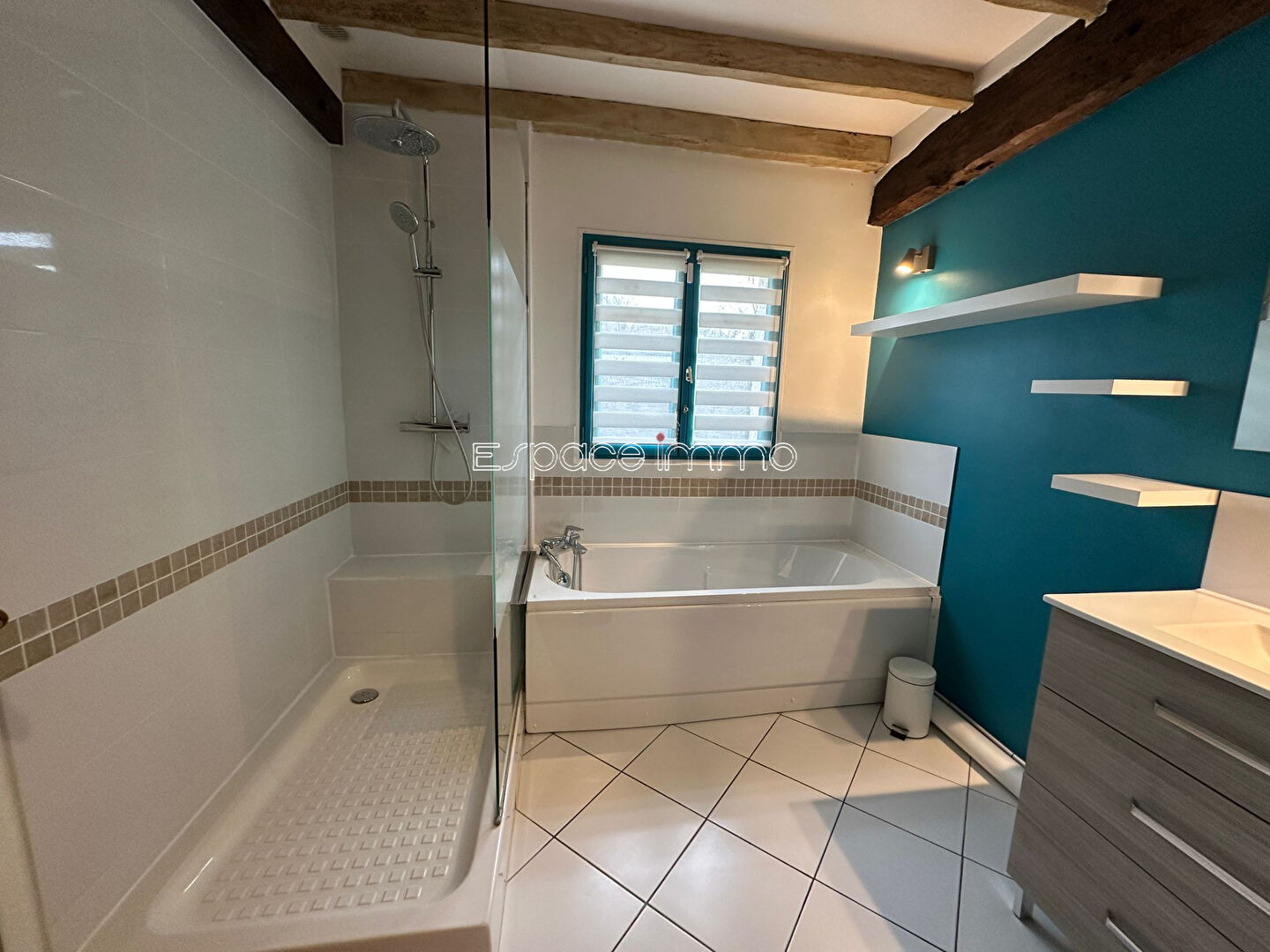 Ce niveau dispose également d'une suite parentale avec salle de bains offrant une baignoire balnéo, double douche, et un double vasque et d'un WC indépendant, permettant une vie de plain-pied. À l'étage, la maison propose deux chambres de 15 m² et 11 m², ainsi qu'une seconde salle de bains avec WC.