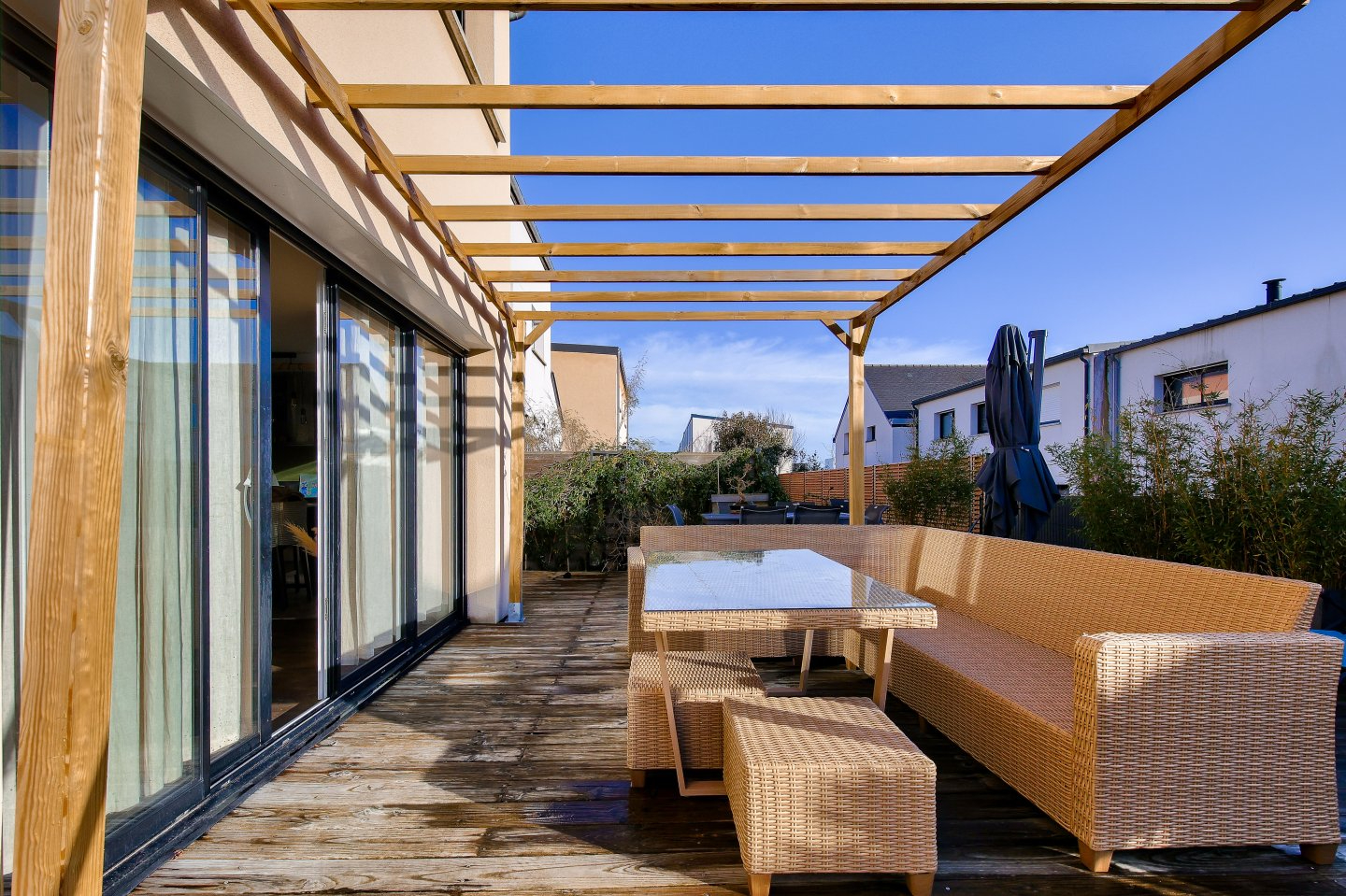 Au rez-de-chaussée, vous profitez d'une agréable pièce de vie salon-séjour de plus de 30 m², baignée de lumière et ouverte sur une grande terrasse exposée plein Sud.