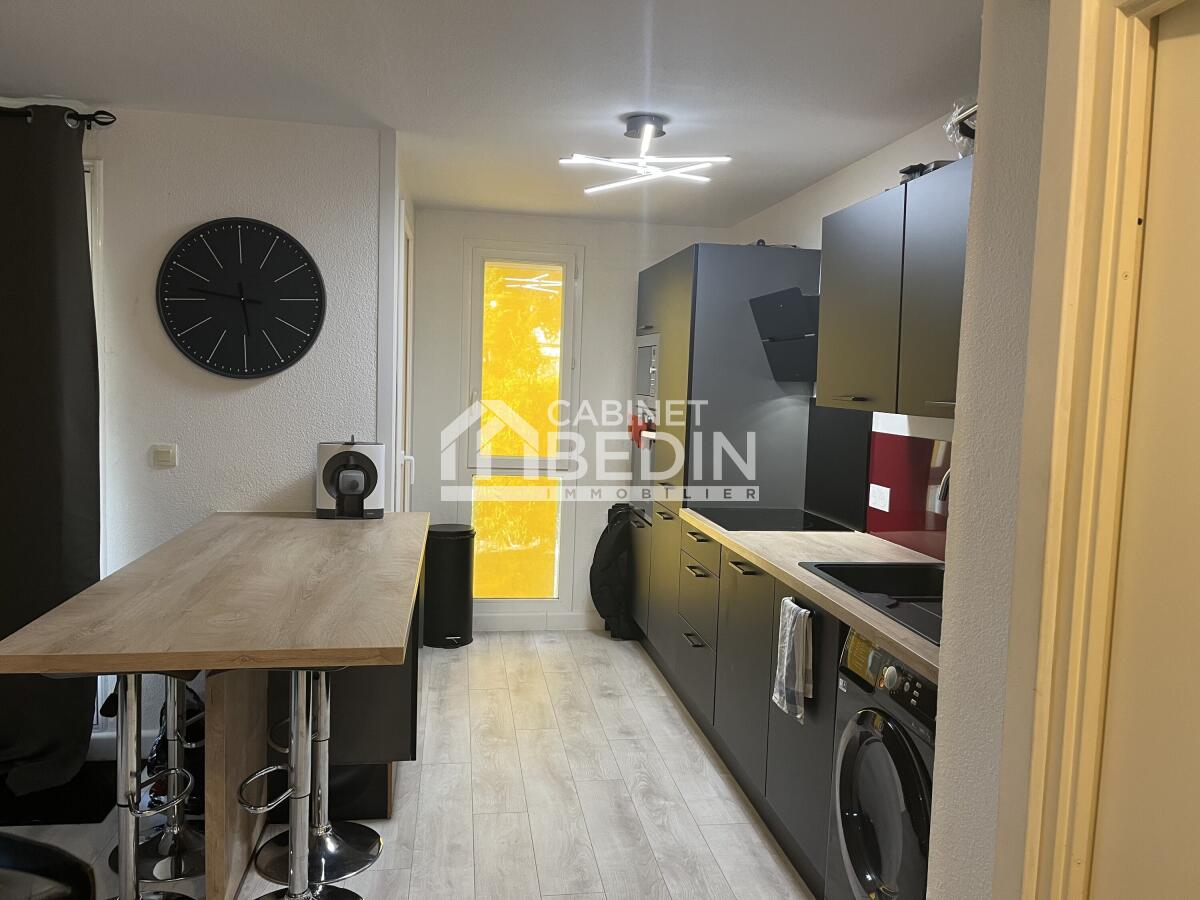 MERIGNAC. NOUVEAUTÉ ! Venez découvrir cet appartement T2 en rez de chaussée de 45m2 comprenant un séjour double exposition donnant sur un agréable balcon couvert, une cuisine Us très récente entièrement aménagée et équipée, une chambre avec placard, une salle de bains et des toilettes séparées. Une place de parking privative complète ce bien. Une visite s' impose !