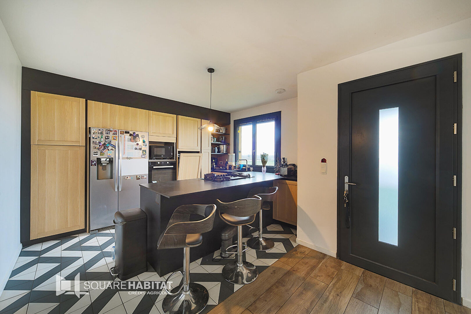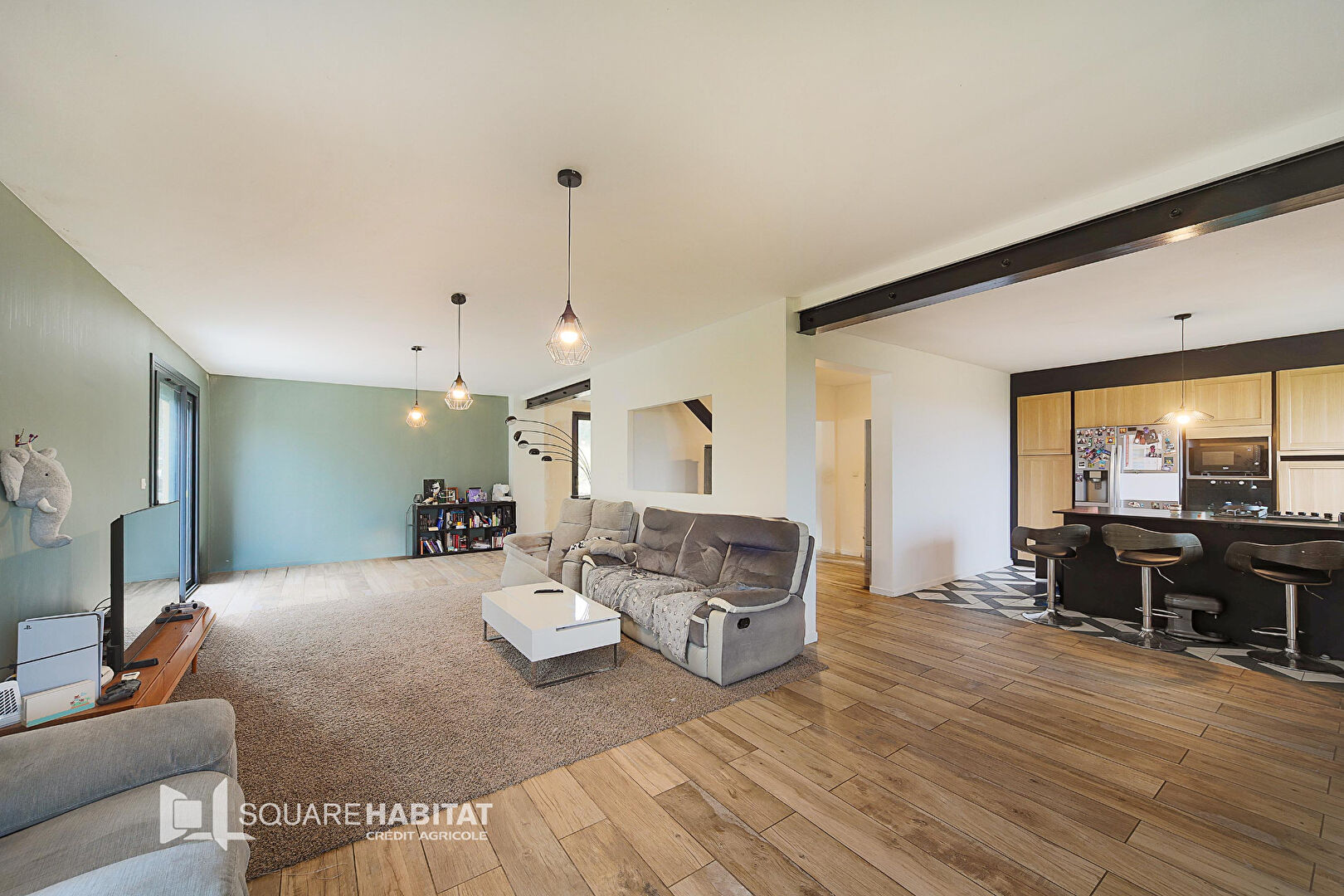 À l'étage, entièrement rénovée, vous trouverez une cuisine équipée ouverte sur un vaste salon-salle à manger, très lumineux.