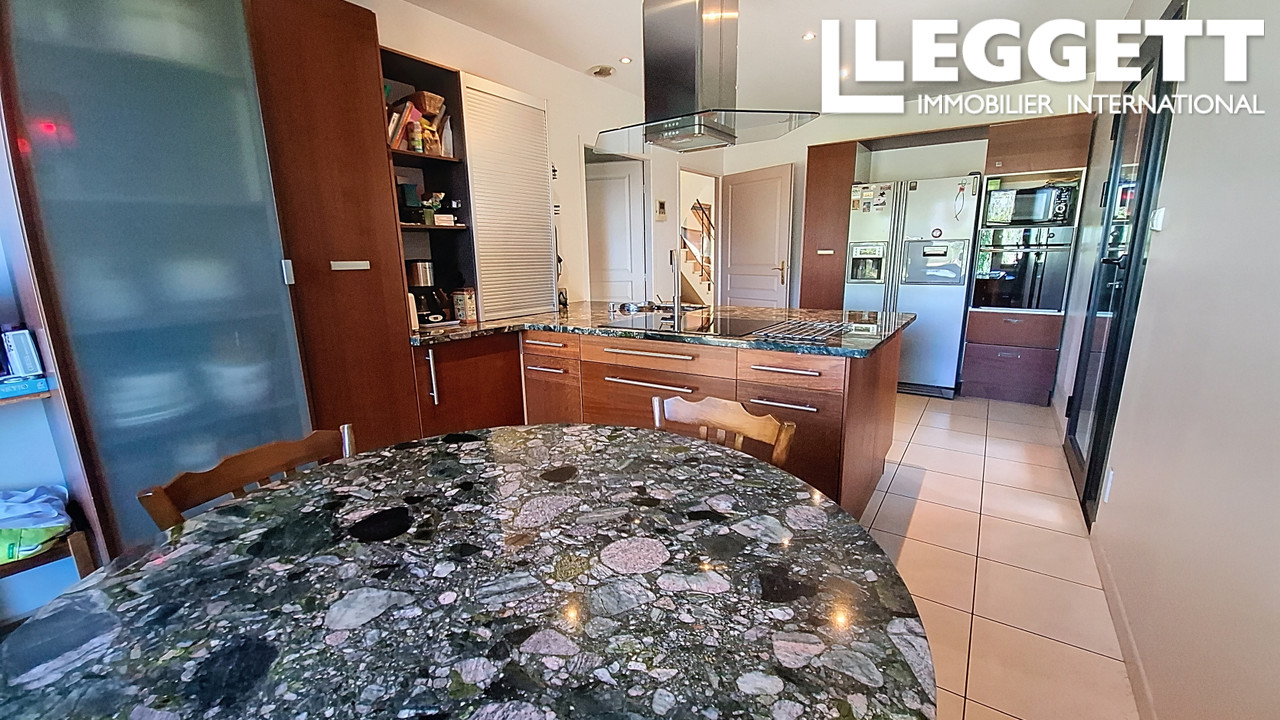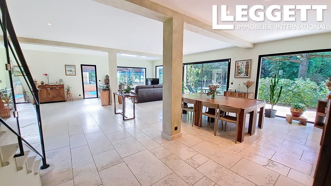 Implantée sur un terrain plat et paysagé de 2 500 m², elle dispose d'une piscine intérieure chauffée de 65 m², véritable espace de bien-être, ouverte sur un vaste salon-salle à manger de 82 m². La cuisine indépendante, avec cellier, s'ouvre sur deux terrasses couvertes et découvertes.