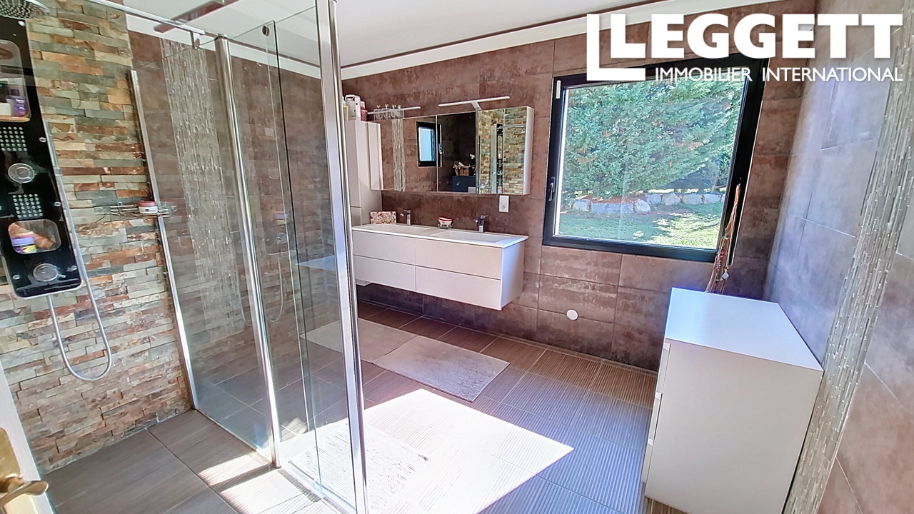 À l'étage, trois grandes chambres, salle de bains et WC complèten le tout Garage de 76 m², maison d'amis indépendante, prestations de standing, géothermie, planchers chauffants et rafraîchissants