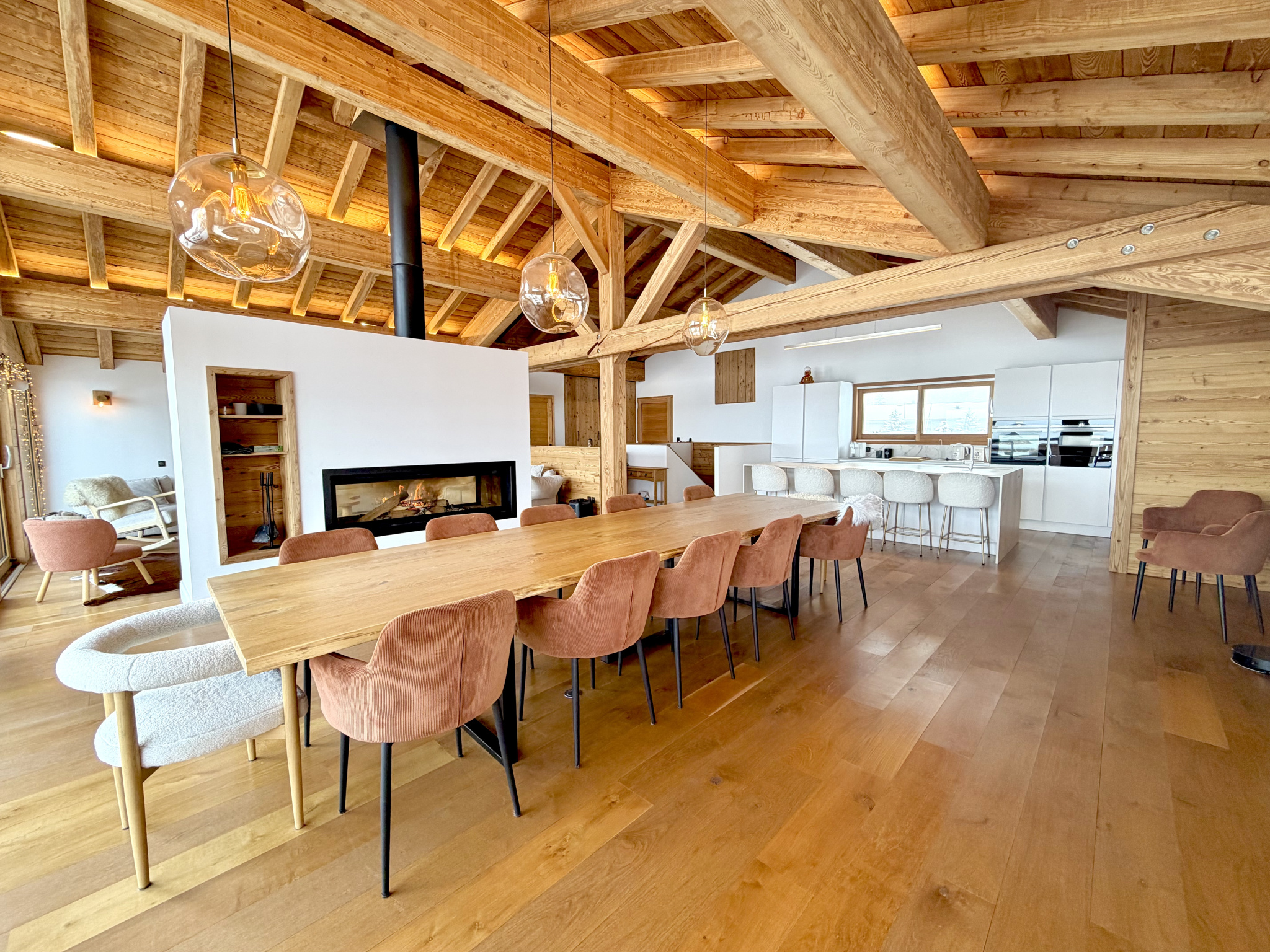 La pièce de vie principale, située à l'étage, constitue le point culminant du chalet. Elle dévoile un volume cathédrale remarquable, sublimé par une charpente traditionnelle apparente et une luminosité omniprésente. L'espace s'organise avec élégance autour d'un salon raffiné avec cheminée centrale, d'une salle à manger conviviale et d'une cuisine ouverte haut de gamme, conçue comme un véritable lieu de partage. De larges baies vitrées prolongent naturellement cet espace vers une vaste terrasse panoramique, exposée sud-est, offrant une vue ouverte et dominante à 360o sur la vallée, la station et les sommets environnants, été comme hiver.