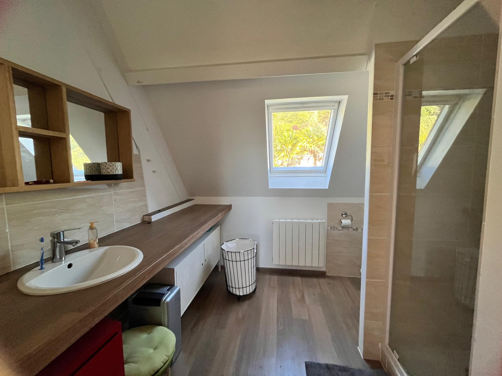 - au rez-de-chaussée : une entrée, une pièce de vie avec cuisine aménagée et équipée ouverte, deux chambres, une salle de bains (douche et baignoire) et des wc.