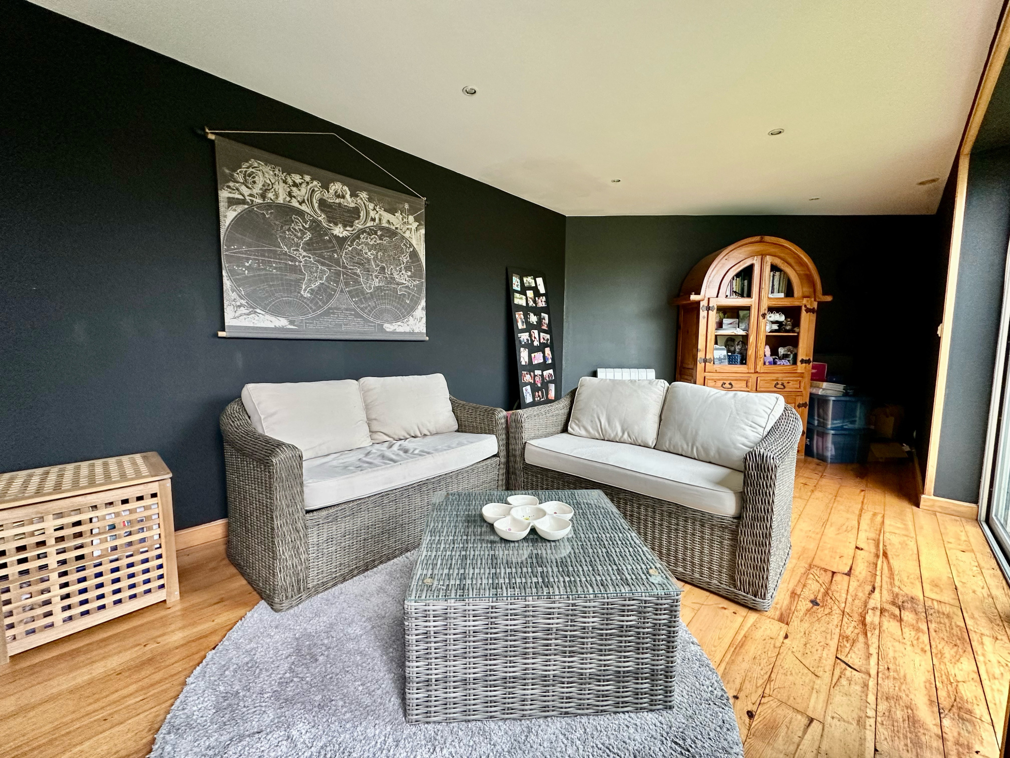 Découvrez cette maison individuelle comprenant au rez-de-chaussée : entrée, un séjour avec cheminée poêle à pellets, cuisine équipée ouverte avec plaque de cuisson, four, hotte et lave-vaisselle et un bureau / salle-de-jeux.
