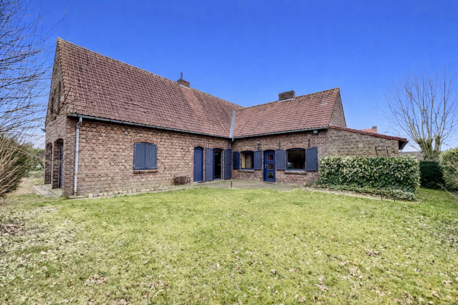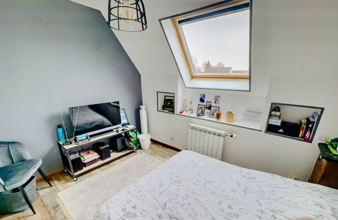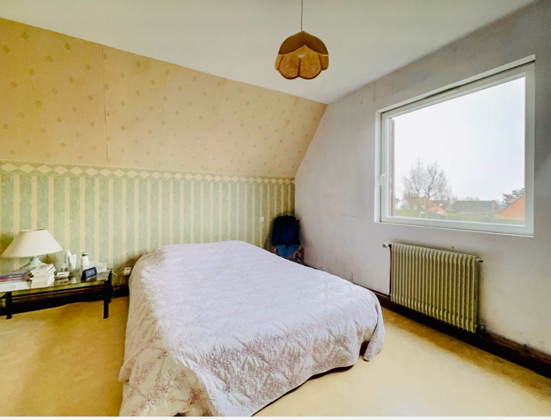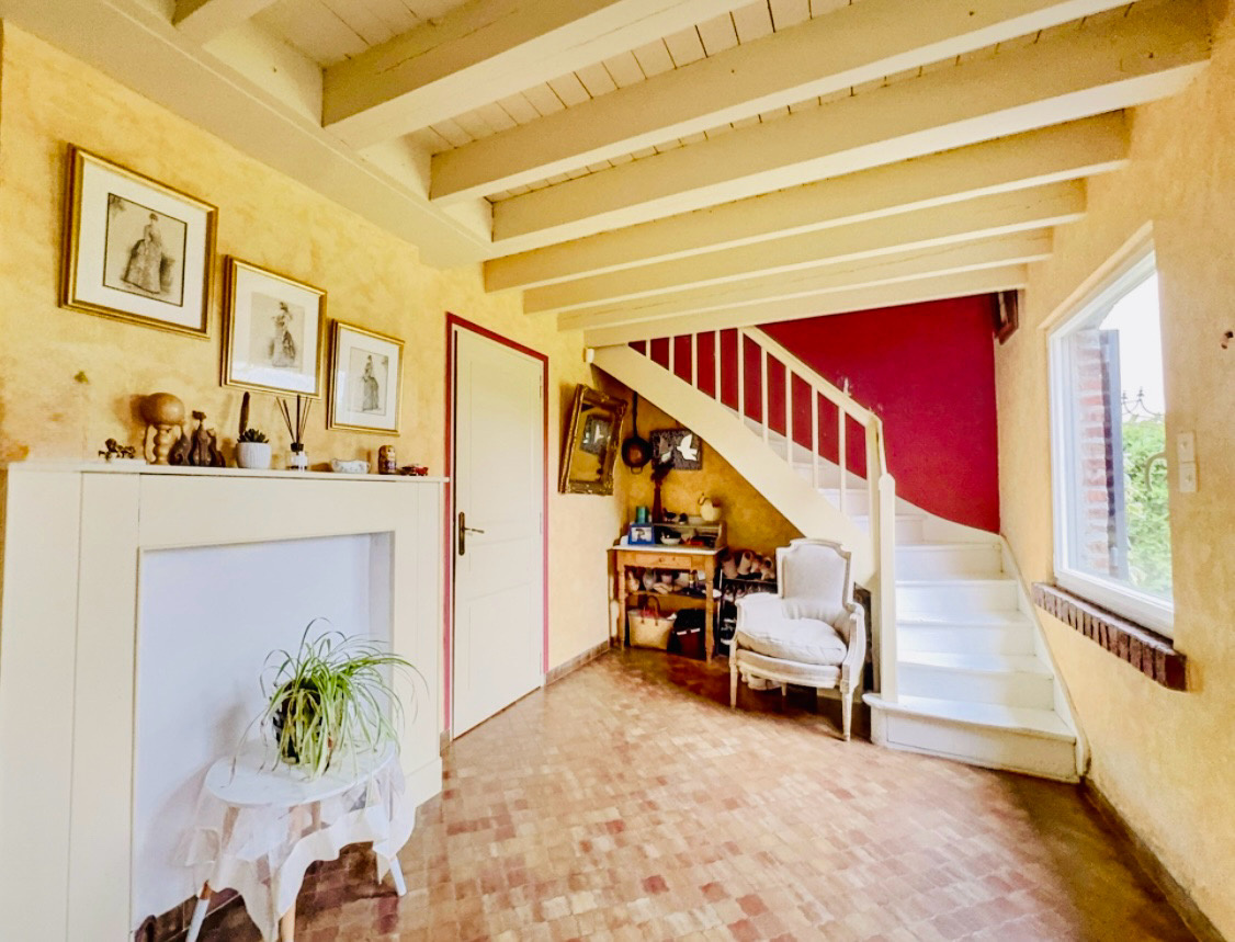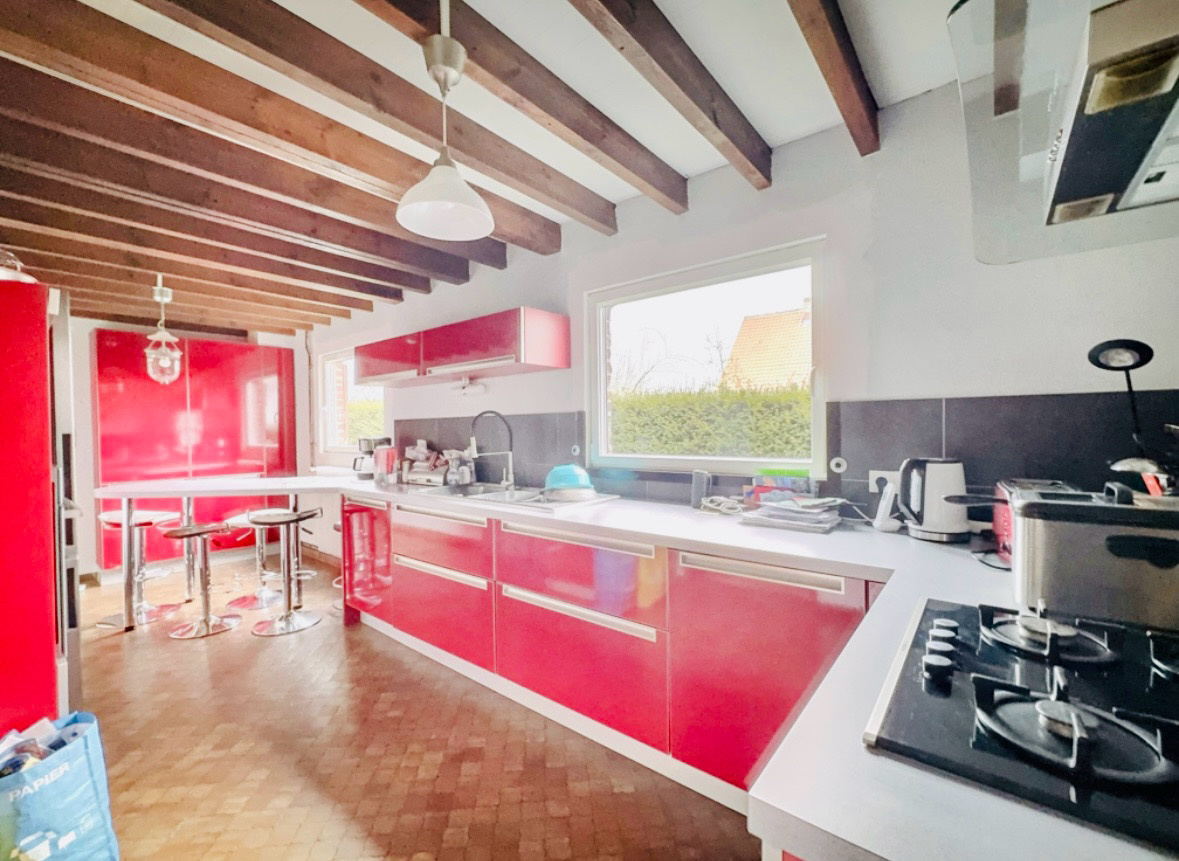 Cette maison individuelle au style flamand vous offre 170 m2 habitables se composant, d'un hall d'entrée, d'une pièce de vie avec insert bois, une cuisine équipée, une salle d'eau, une buanderie