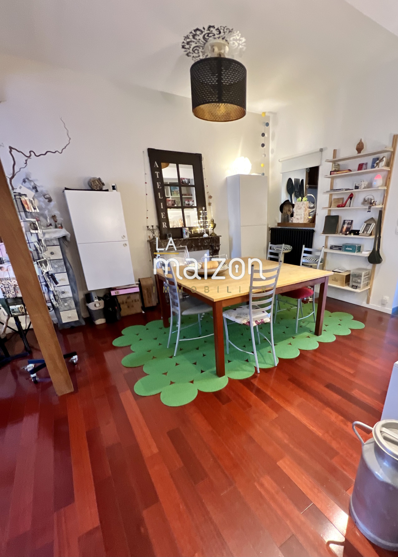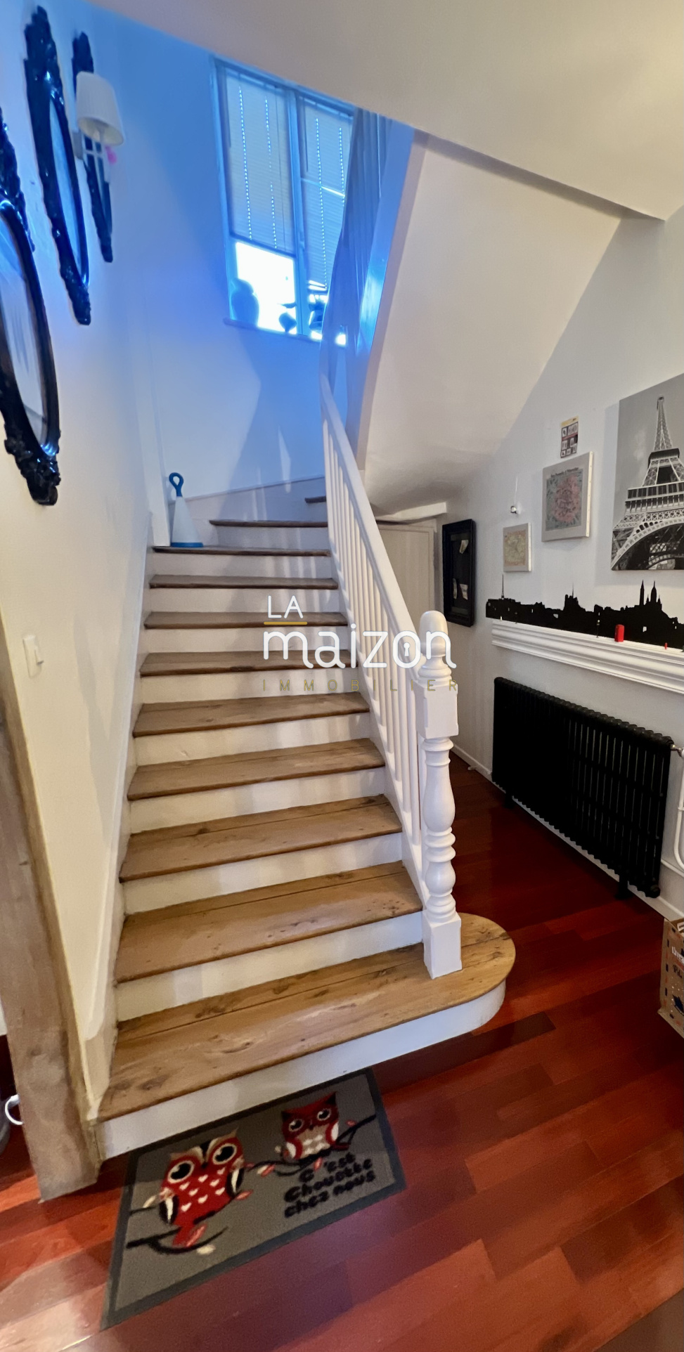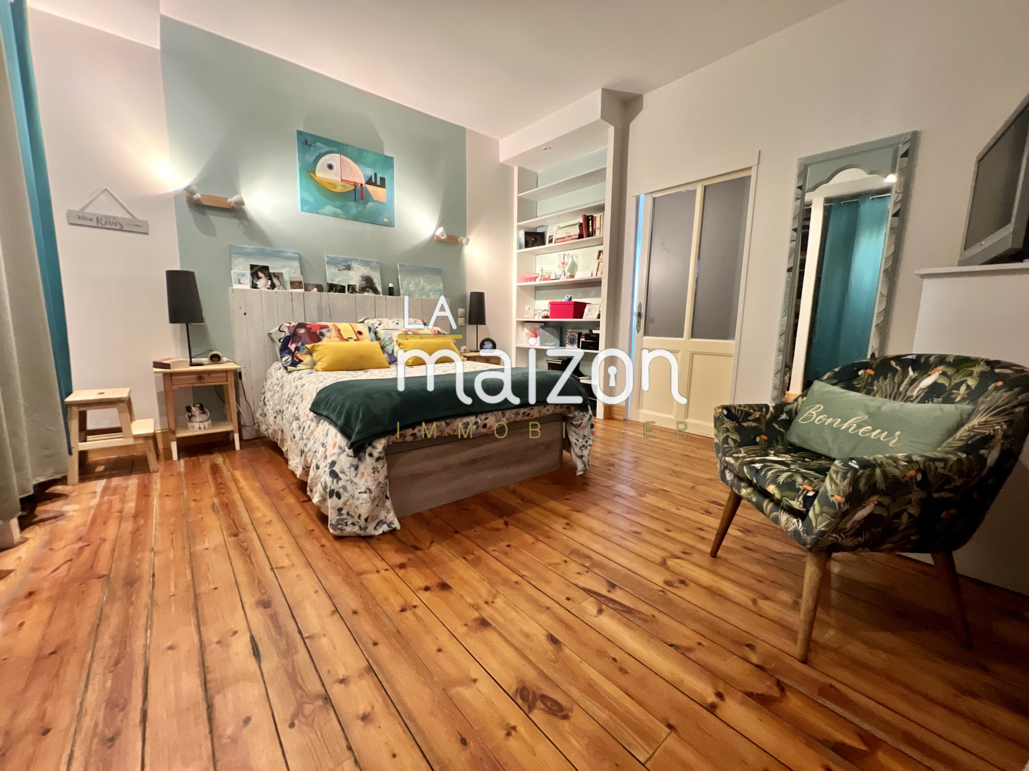 Elle est composée d'une belle pièce de vie de 40 m2 avec un accès direct à la cuisine et son ilôt central. Les étages offrent 5 grandes chambres, 2 salles d'eau et un coin bureau. Le tout est sur parquet.