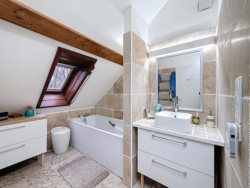 L'étage s'organise autour d'un grand palier tout en longueur qui dessert, de part et d'autre, trois chambres, une salle de bains récente ainsi qu'un WC indépendant, permettant une séparation harmonieuse entre les espaces jour et nuit.