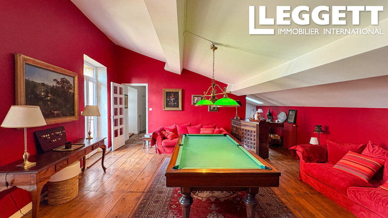 L'étage supérieur, accessible par escalier intérieur ou par une entrée indépendante depuis la cage d'escalier commune, s'apparente presque à un second appartement. Il propose un second salon aménagé en salle de jeux avec billard, une chambre, une salle de bains, une buanderie et une pièce actuellement utilisée comme salle de sport, pouvant faire office de cinquième chambre. Deux terrasses intimistes complètent ce niveau.