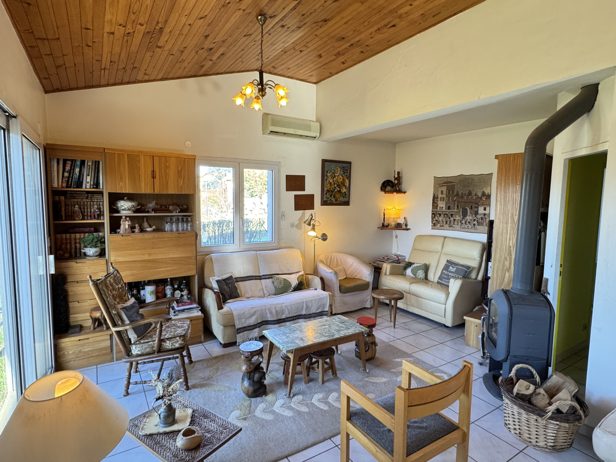 La maison est chauffée par des blocs climatisation réversibles et radiateurs électriques, ainsi qu'un poêle à bois dans le salon. DPE: D
