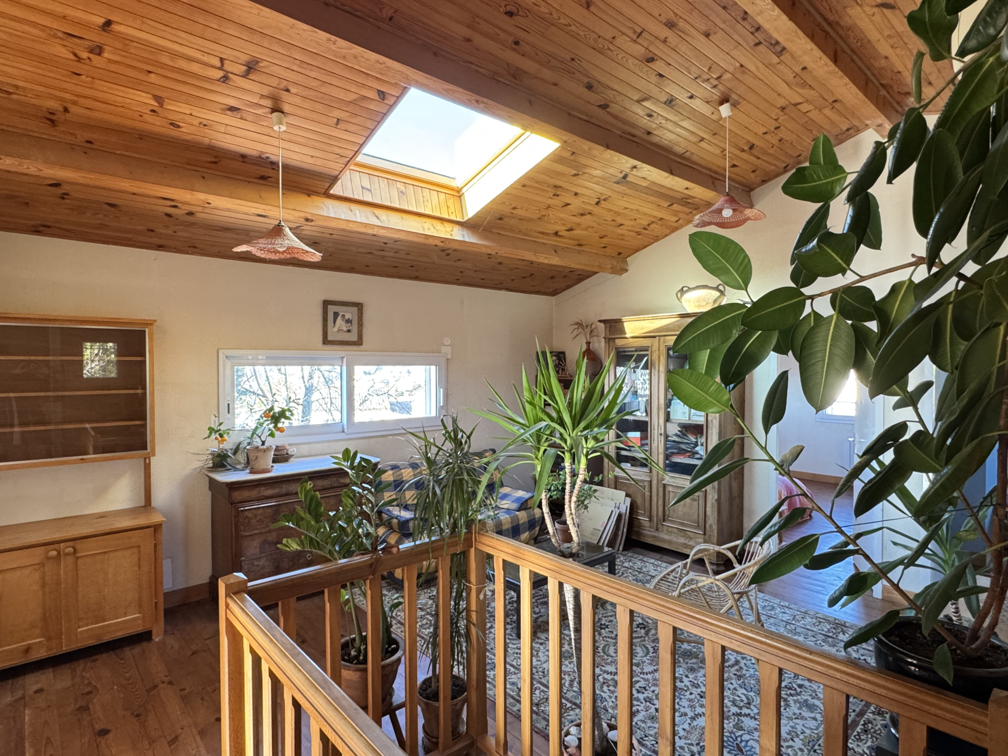 A l'étage, un bel espace mezzanine salle de jeux mansardé, quatre chambres avec placards et une salle de bains avec baignoire, wc séparé.