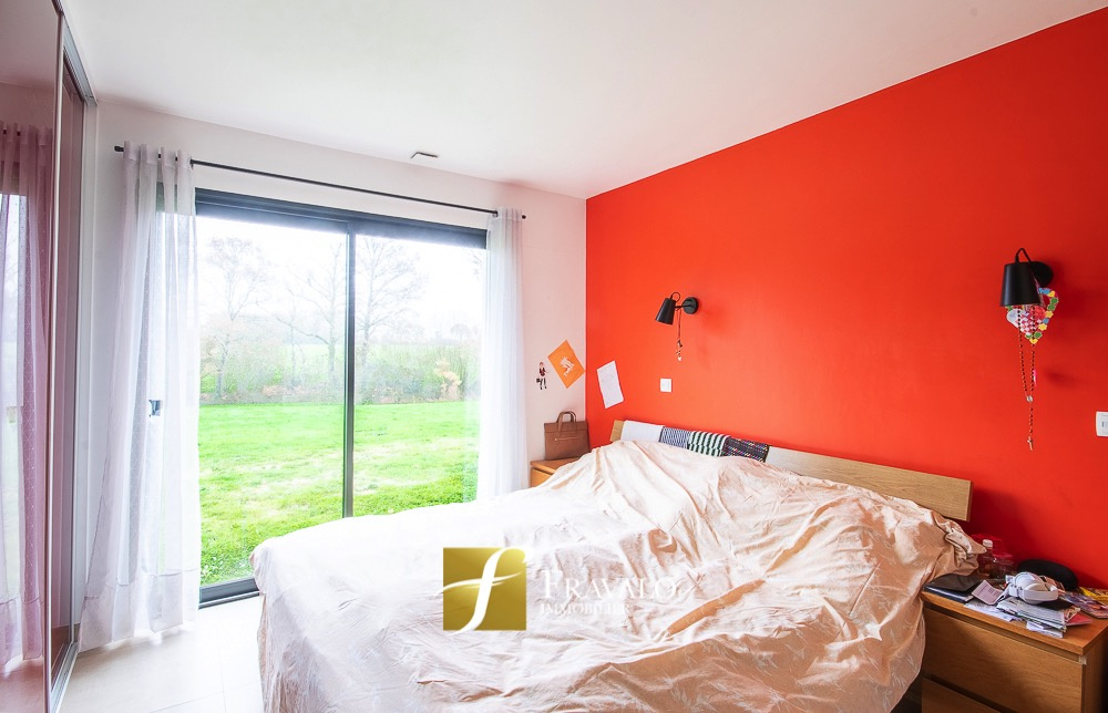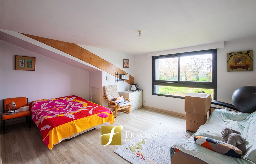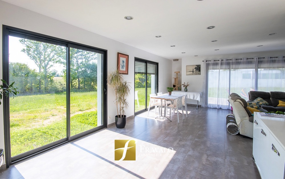 Idéalement située à quelques minutes du bourg de Ploeren et à proximité de l'entrée de Vannes, spacieuse maison contemporaine d'environ 150 m2. Elle se compose au rez-de-chaussée d'une entrée, d'un lumineux salon-séjour avec vue sur la verdure, d'une cuisine fonctionnelle aménagée-équipée, d'un bureau, d'une suite parentale avec salle de bains, d'un wc et d'une buanderie. A l'étage, le palier dessert trois chambres (entre 15 et 17 m2), une salle d'eau et un wc. Ce bien vous est proposé sur un terrain de plus de 3800 m2. Un double garage complète la prestation. Estimation des coûts annuels d'énergie pour un usage standard du logement: entre 760 EUR et 1070 EUR (abonnement compris). Les informations sur les risques auxquels ce bien est exposé sont disponibles sur le site Géorisques : georisques.gouv.fr.