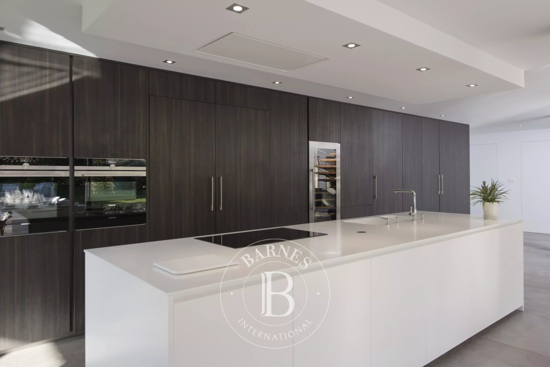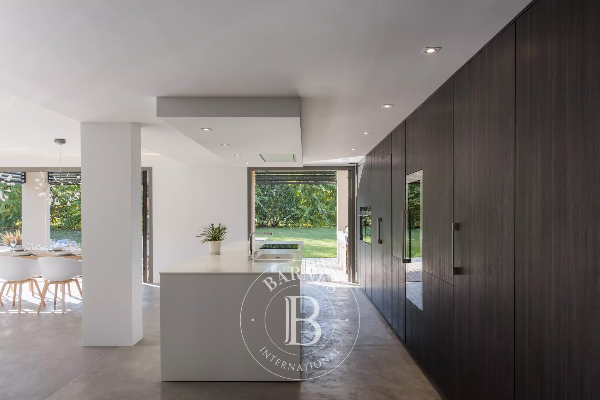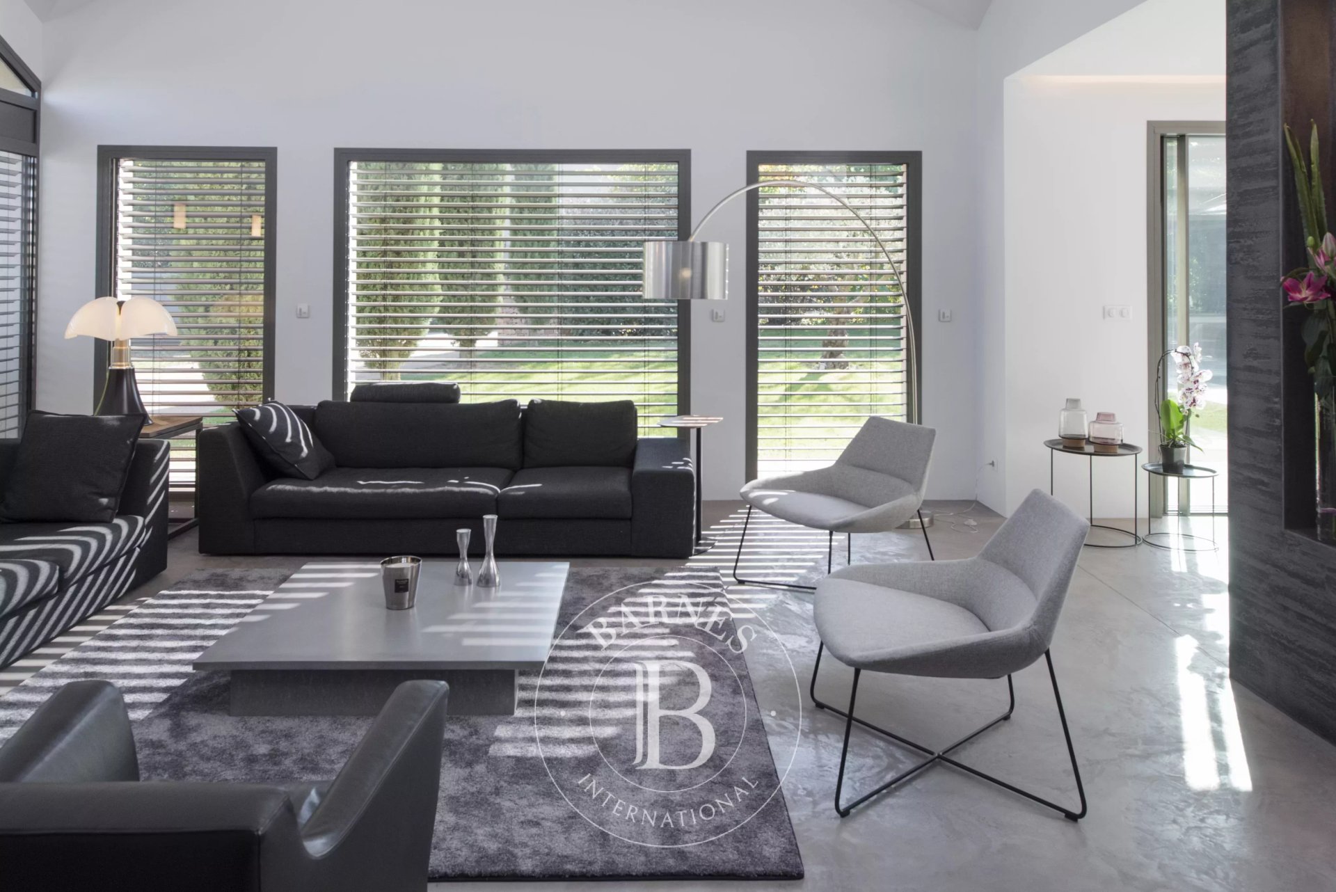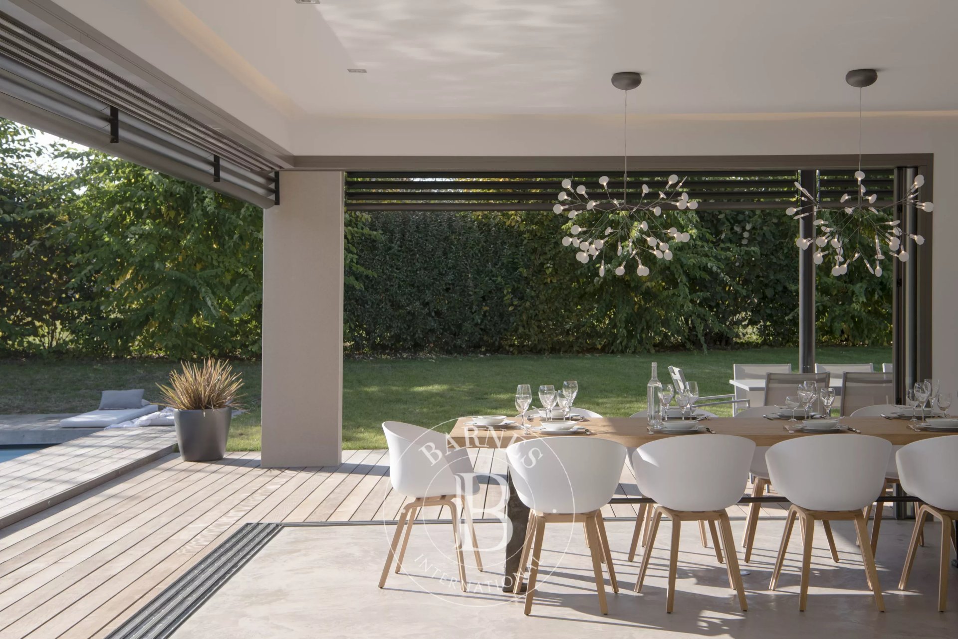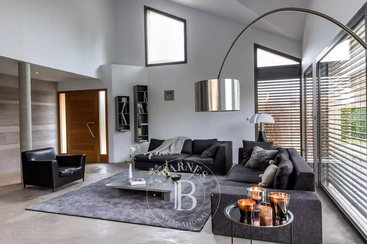 L’architecture aux toits à pans coupés, les volumes spectaculaires et les baies vitrées XXL à galandage de 12 mètres linéaires signent une réalisation d’exception, où l’intérieur et l’extérieur ne font plus qu’un. Le regard s’ouvre naturellement sur le jardin, la piscine et son pool house, dans une continuité fluide et élégante.