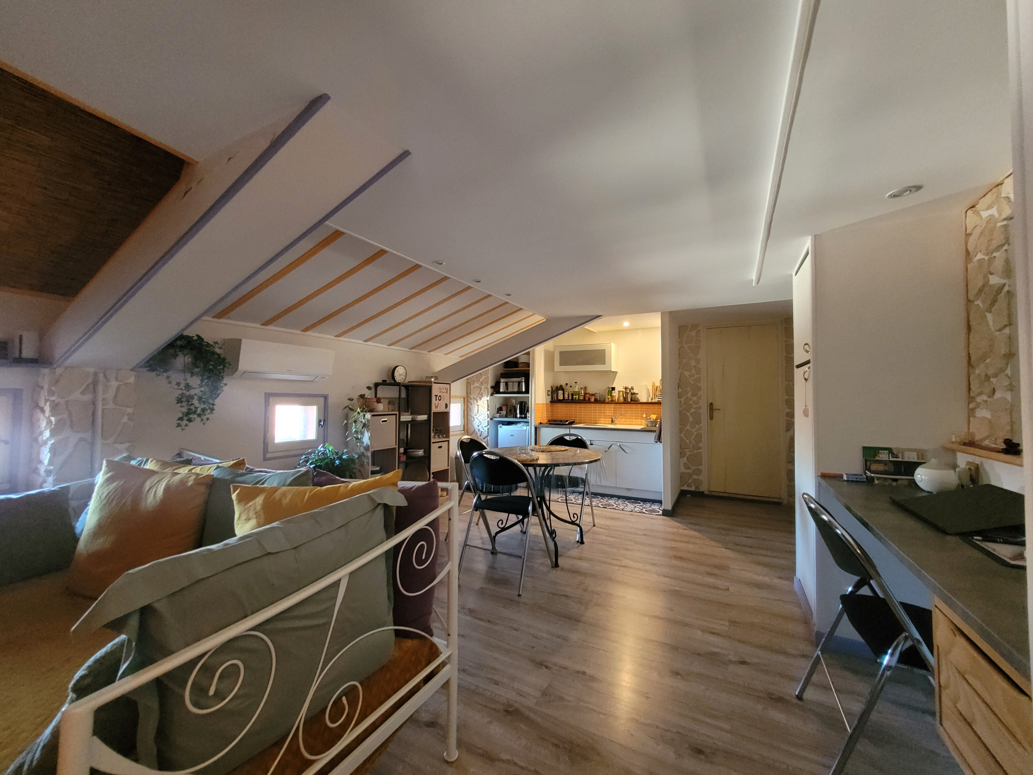 L'entrée s'ouvre sur une pièce de vie lumineuse avec grande hauteur sous plafond équipée d'un poêle à granules, un séjour avec cheminée ainsi qu'une cuisine / salle à manger avec climatisation réversible et accès sur le jardin.