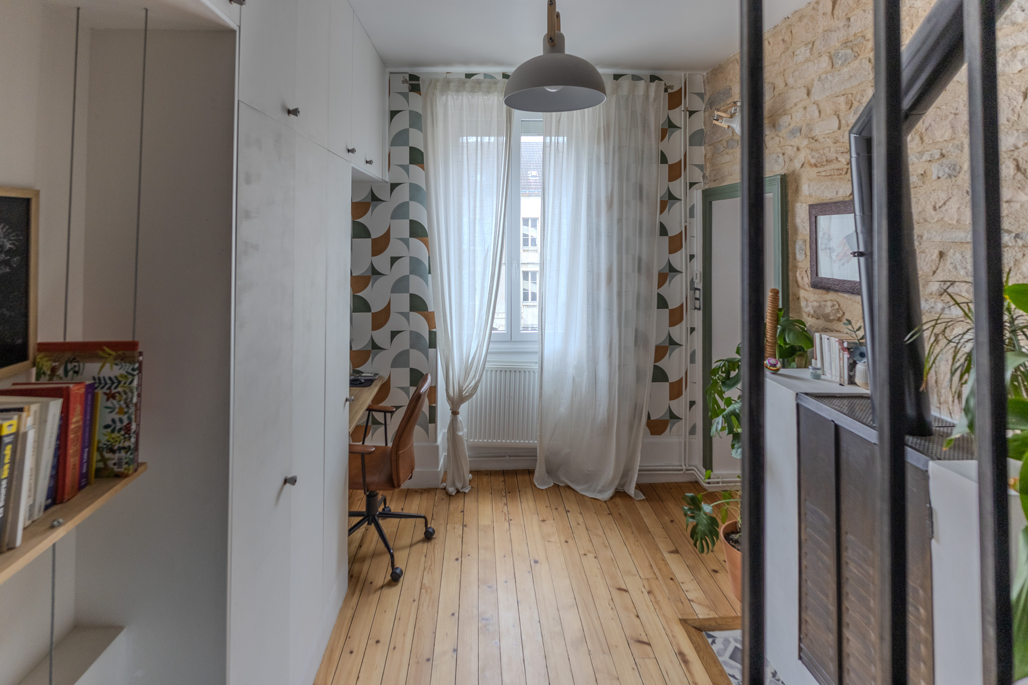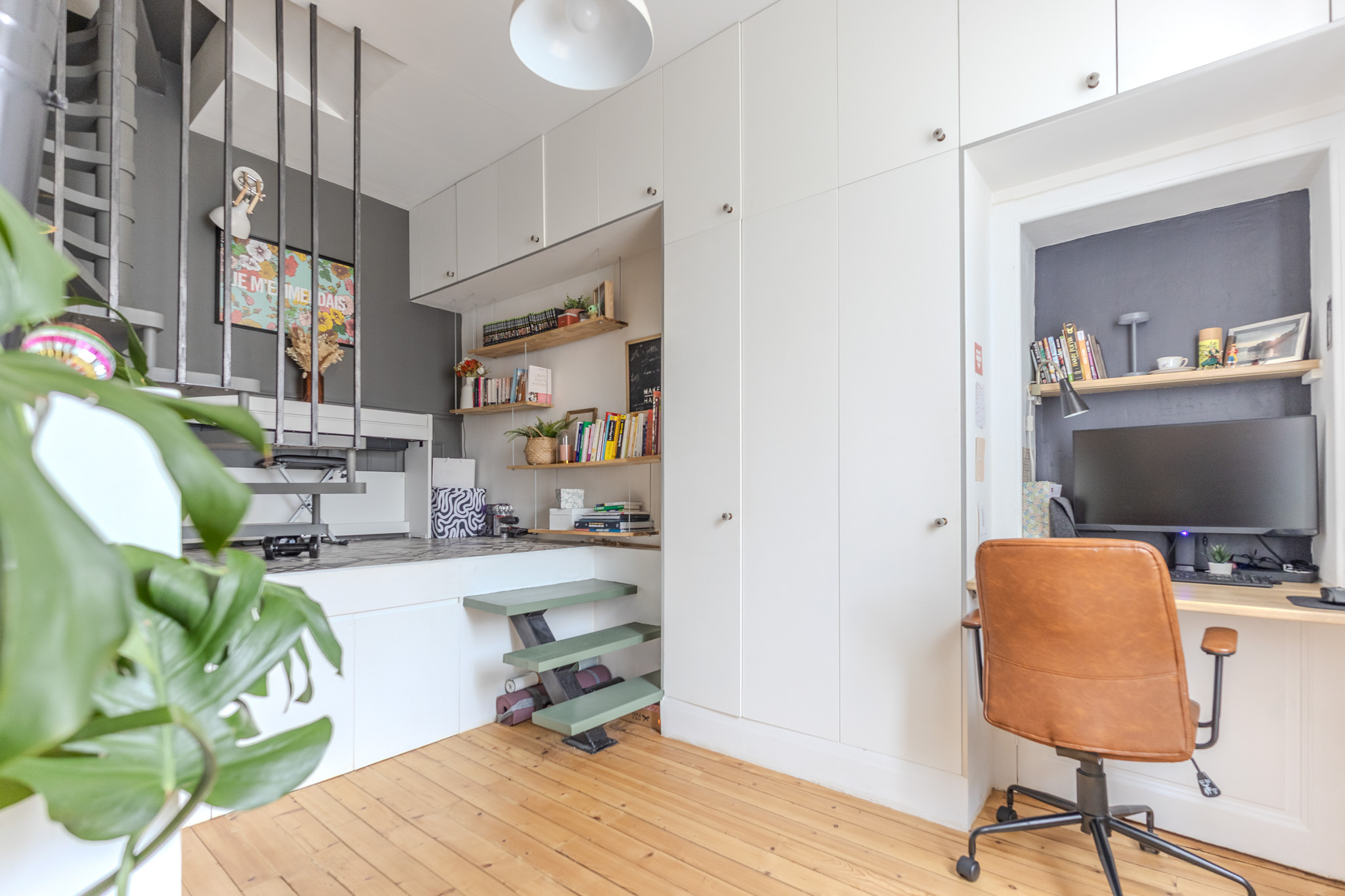 Un coin bureau plein de charme, idéal pour le télétravail ou un espace lecture, s'intègre harmonieusement à l'ensemble.