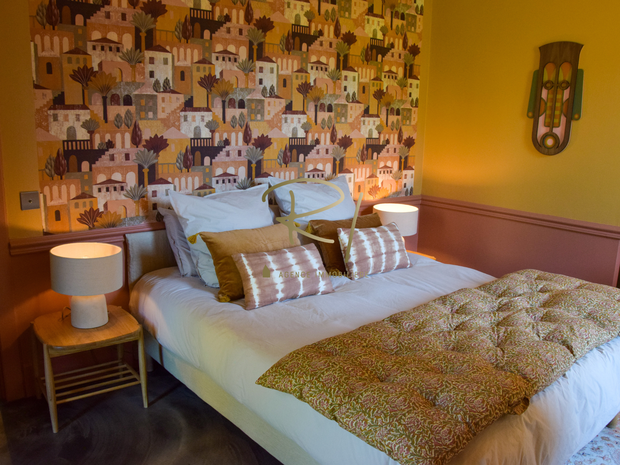 Les prestations intérieures soulignent le standing du lieu : belles hauteurs sous plafond, sols en béton ciré, chauffage au sol, climatisation gainable, cheminée à double foyer et escaliers en pierre.