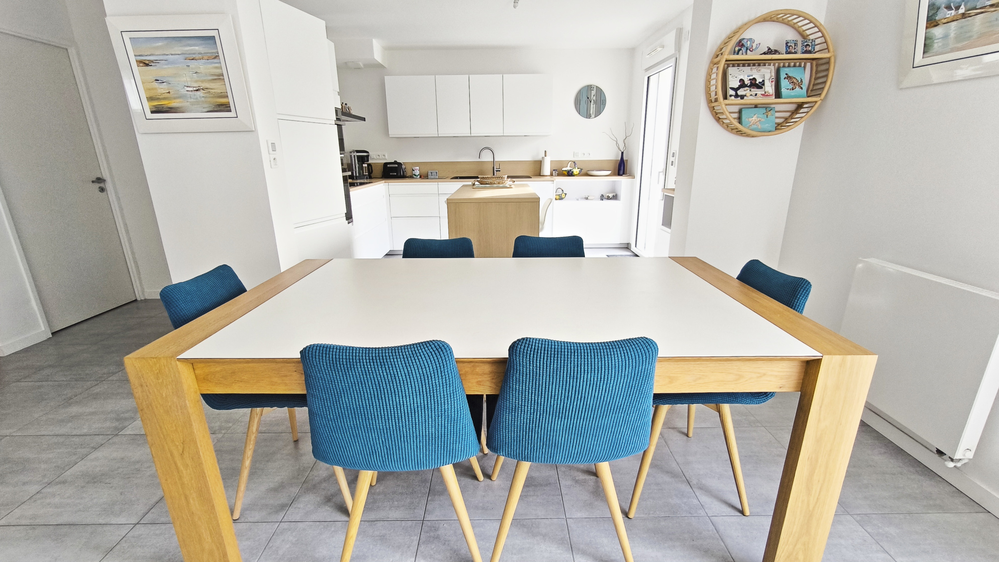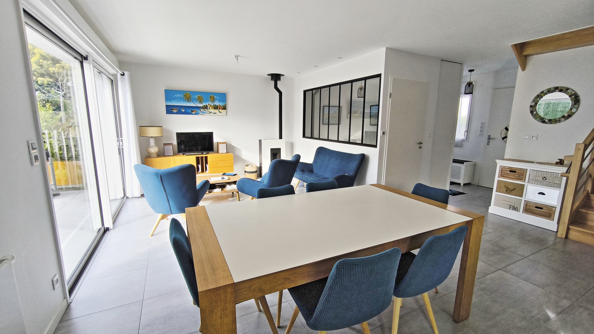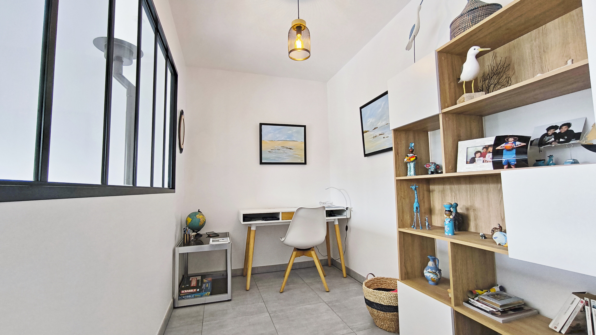 Carnac Maison de 2022 de 108 m2 habitables proche de la Grande Plage sur 2 niveaux composée au RDC d'une entrée donnant sur lumineux séjour avec salon et poèle hautes performances, espace repas, cuisine équipée ouverte, un bureau, salle d'eau et WC.