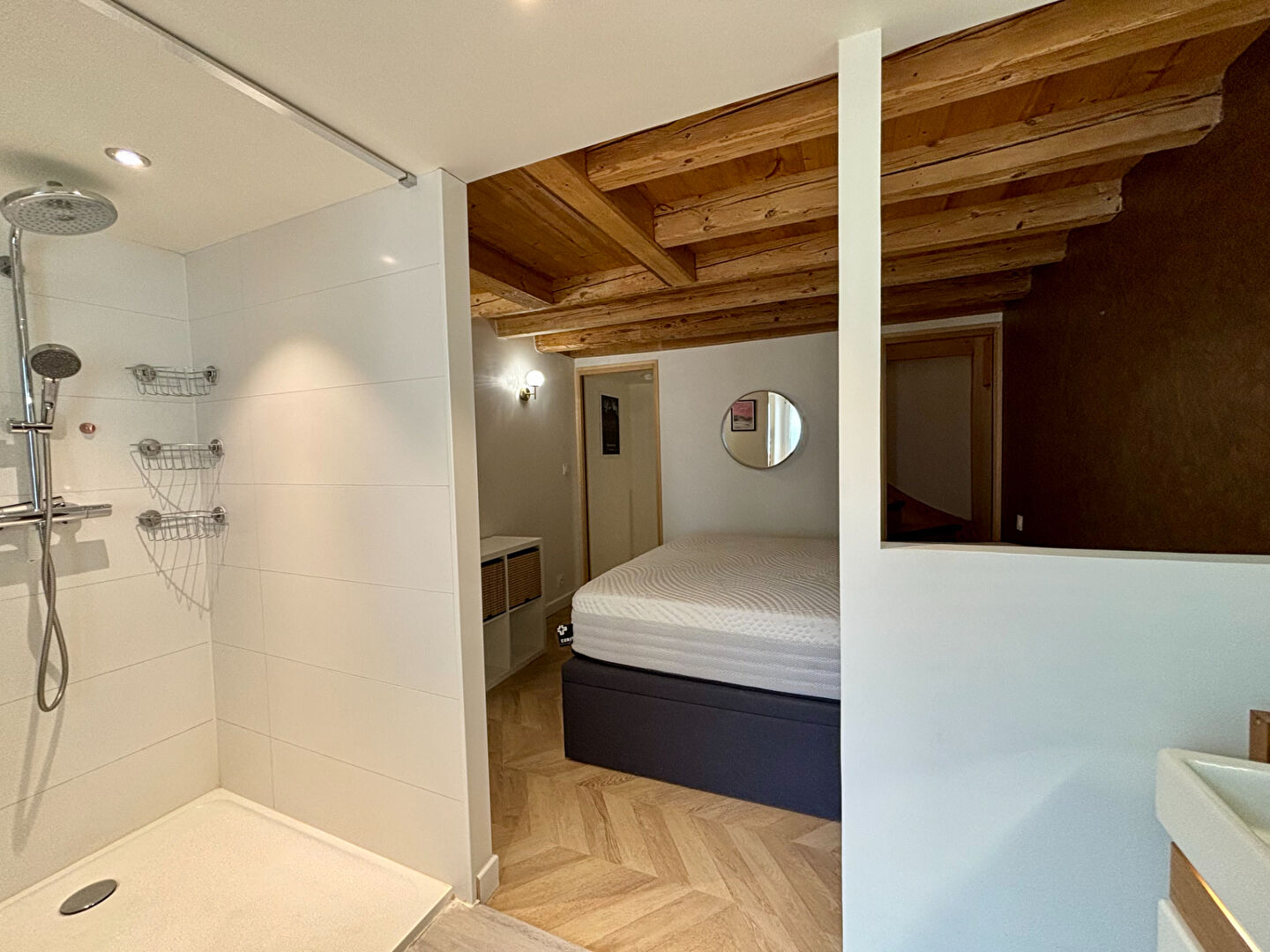 À l'étage, se trouve une première chambre sur la mezzanine.