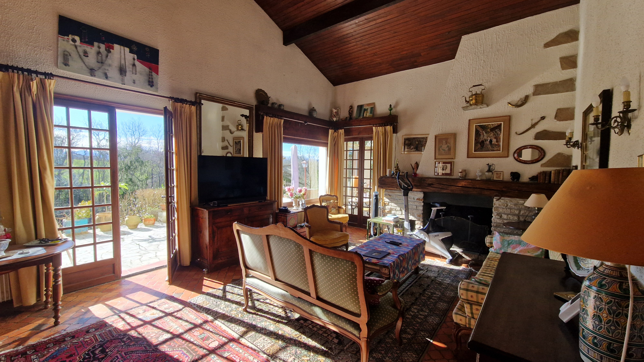 Au rez-de-chaussée, le séjour cathédrale avec cheminée, la salle à manger et la véranda s'ouvrent sur une grande terrasse au Sud. La cuisine, l'entrée avec vestibule et WC, ainsi que deux chambres et une salle de bains complètent ce niveau.