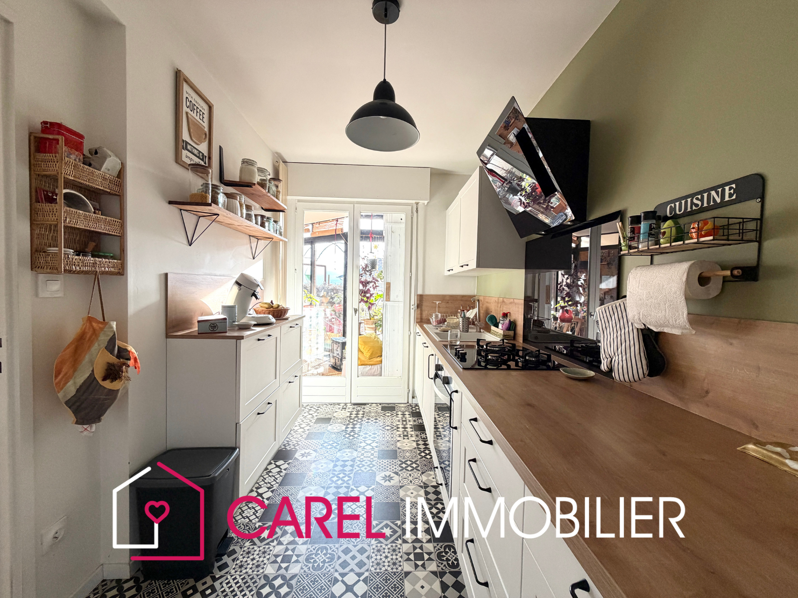 Le salon d'une surface confortable de près de 30m2 est un vrai cocon. La cuisine séparée refaite en 2023 est toute équipée.