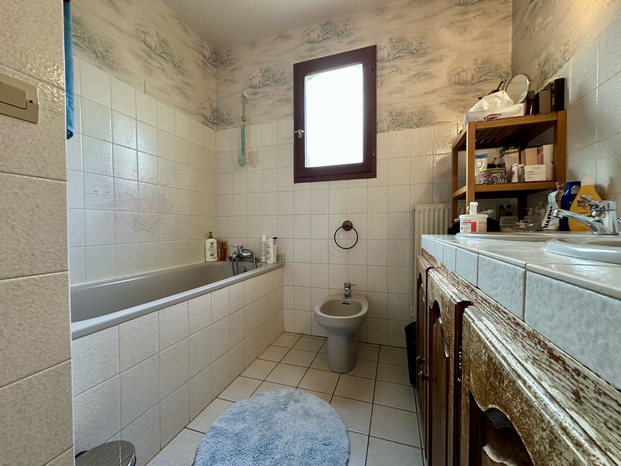 La maison se compose de : o Sous-sol : cave ; o Rez-de-chaussée : grand garage, une chambre, WC avec lave-mains ; o Rez-de-jardin : entrée, cuisine équipée, salon/séjour lumineux avec cheminée, ouvrant sur la terrasse et le jardin ; o Demi-niveau : trois chambres, salle de bains, WC avec lave-mains.