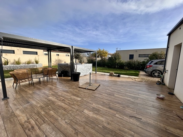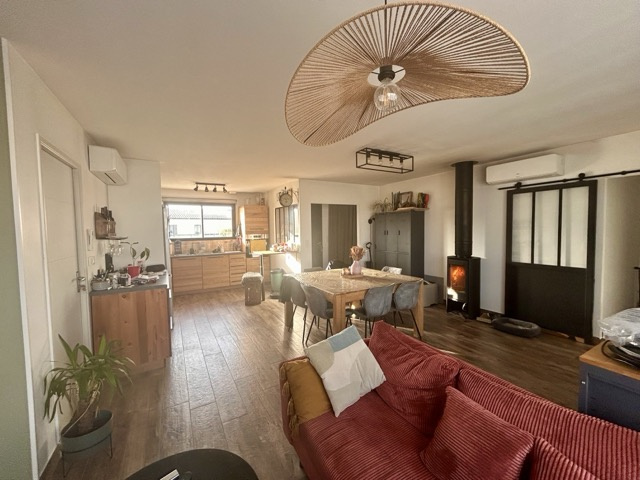 Maison de construction récente offrant une entrée, une grande pièce de vie lumineuse avec cuisine équipée et poêle à bois, 3 belles chambres dont une suite parentale avec salle d'eau et dressing, une salle d'eau et des toilettes.Un garage complète le bien, implanté sur un terrain clos, arboré et paysagé de 652 m2.