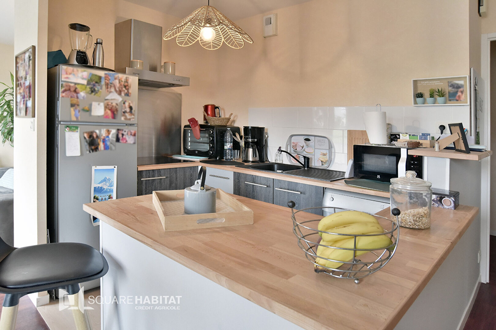 Belle entrée/dégagement avec placard, pièce de vie avec coin cuisine et salon donnant sur un balcon avec vue dégagée, deux chambres, salle de bains et les toilettes séparés.
