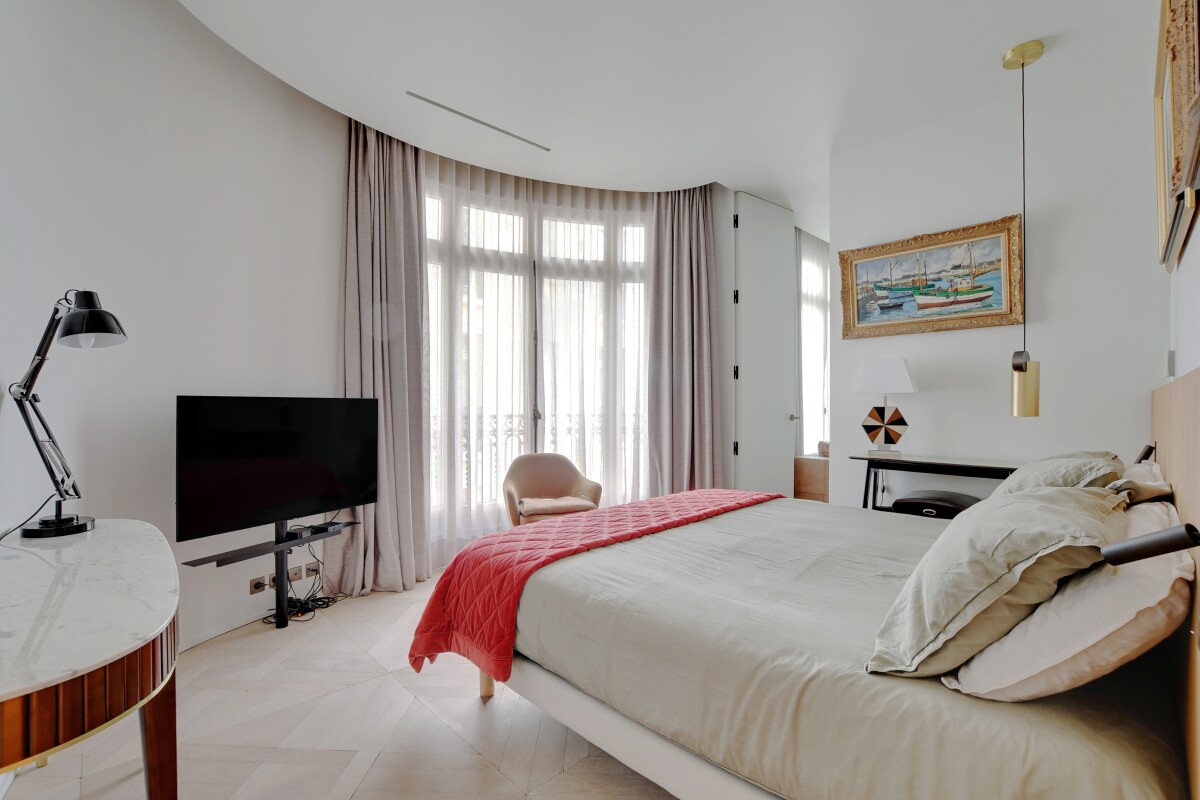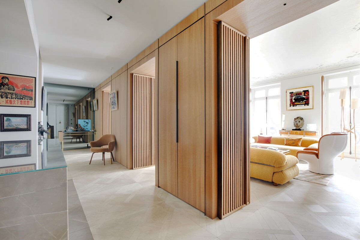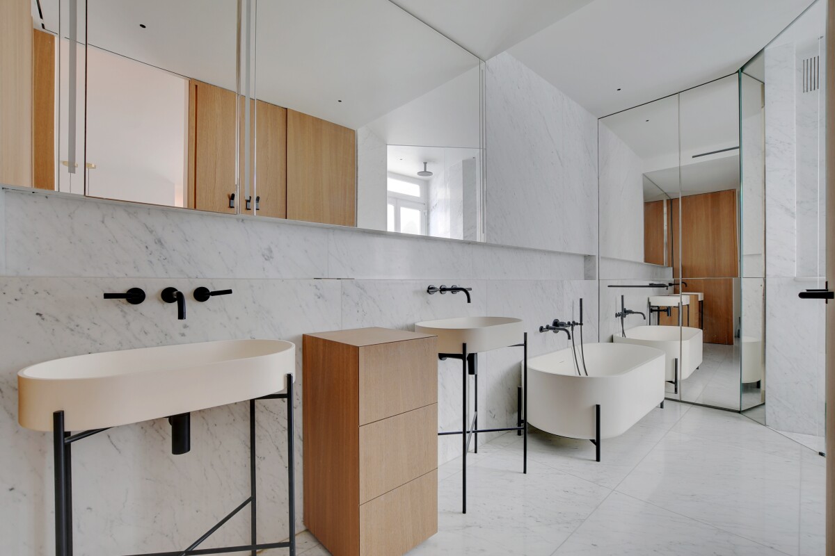 Un couloir à l'ambiance feutrée, animé de jeux de miroirs et d'éclairages, accompagne ensuite la transition vers la partie nuit. Celle-ci se compose d'une suite parentale sur cour, dotée d'un dressing en placage de noyer, verre et cuir, et d'une salle de bains en marbre, ainsi que de deux autres chambres sur cour, chacune disposant d'un accès direct à une salle de bains en feuille de pierre.