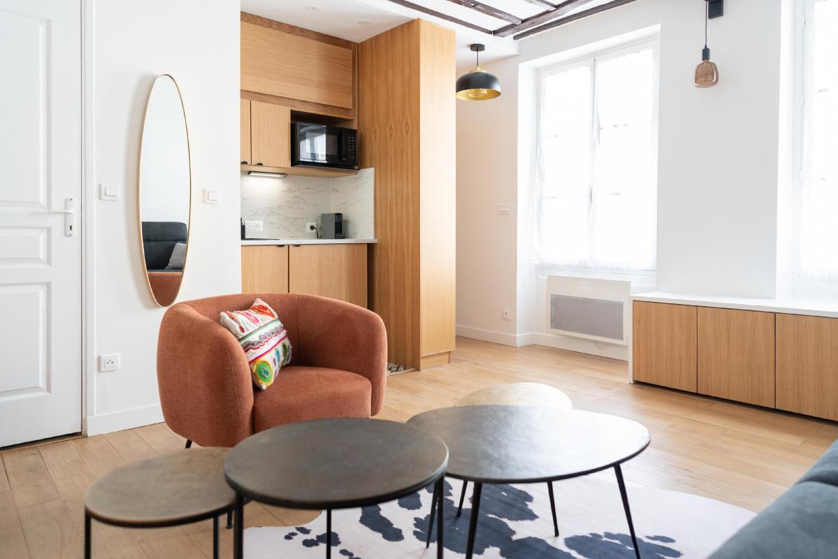 Le charme de l'ancien s'exprime pleinement à travers de superbes poutres d'époque et des rangements sur mesure, conférant à l'ensemble une atmosphère chaleureuse et authentiquement parisienne.