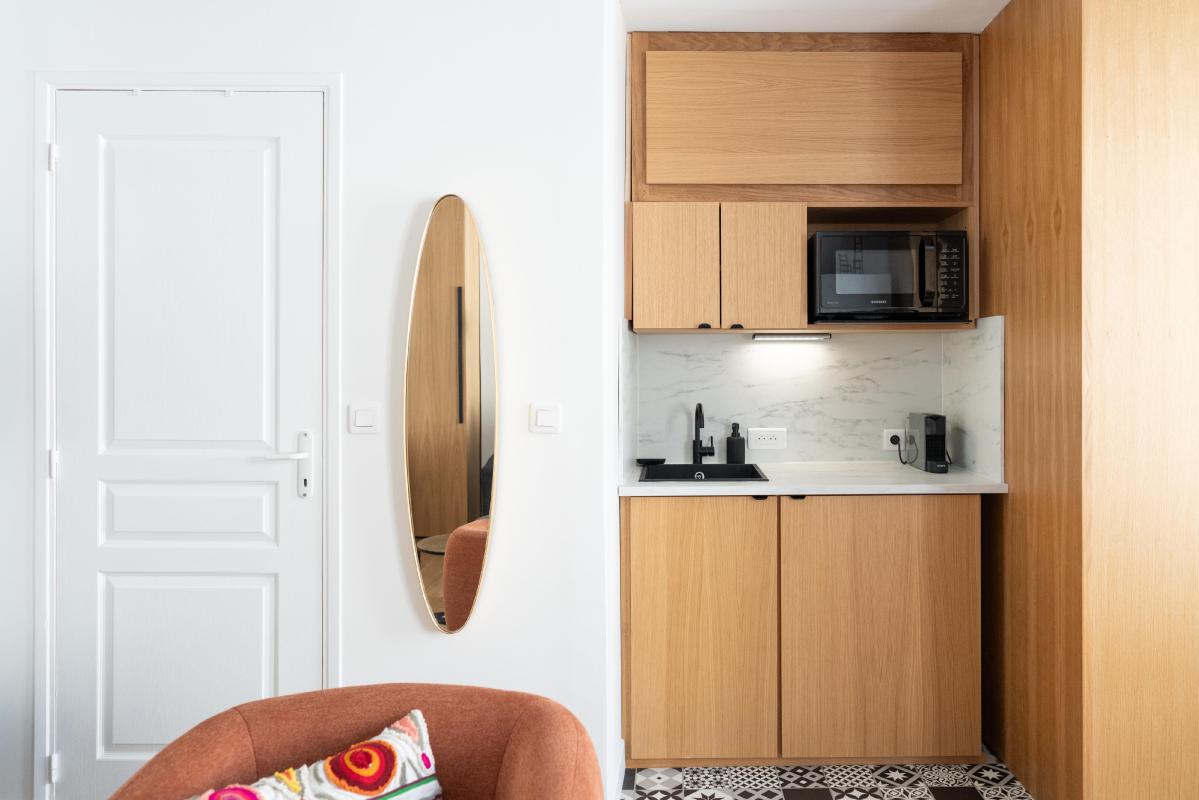 Pensé dans les moindres détails, l'appartement offre un plan parfaitement optimisé avec une belle pièce principale de 21 m² intégrant une kitchenette discrète et une salle d'eau avec toilettes.