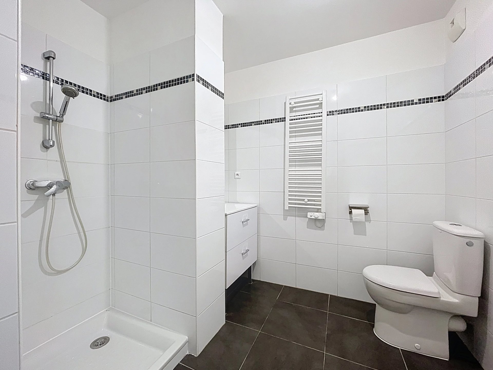 L'appartement comporte une entrée, un séjour intégrant une CUISINE ÉQUIPÉE et AMÉNAGÉE, ouvrant sur un BALCON, ainsi qu'une GRANDE salle de douche avec WC.