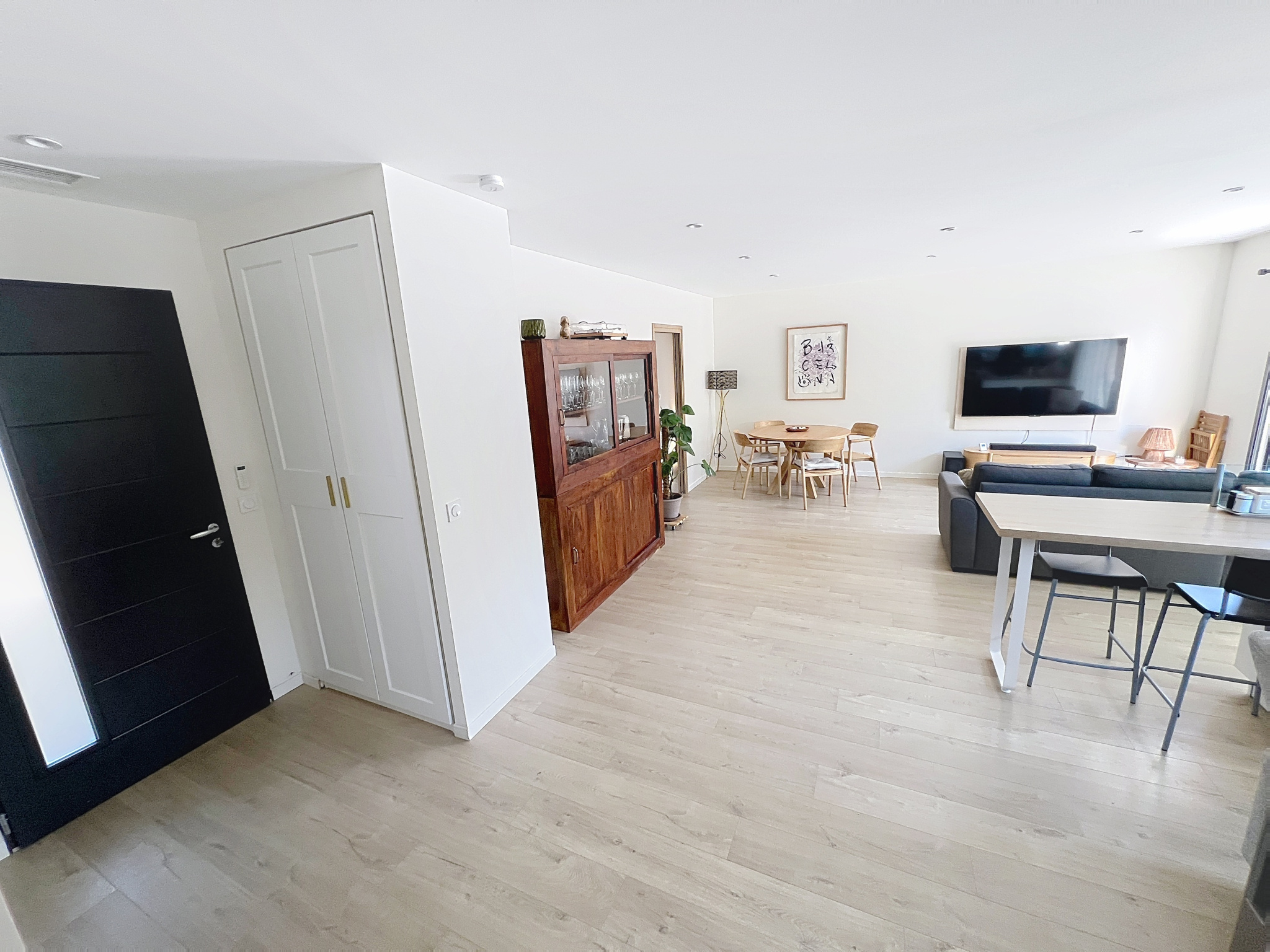 VILLA 3 FACES DE PLAIN PIED ENV 90 M2 SUR 400 M2 DE TERRAIN - PISCINE EN BOIS ENTERREE - CONSTRUCTION DE 2021 SOUS GARANTIE DECENNALE (GROS OEUVRE ET CHARPENTE ) - GARAGE TRAVERSANT CARRELE ET ISOLE - STATIONNEMENT VEHICULE DEVANT GARAGE-PLACARDS RANGEMENT EXTERIEUR
