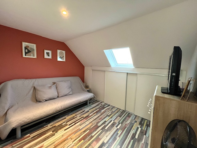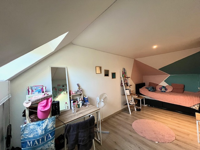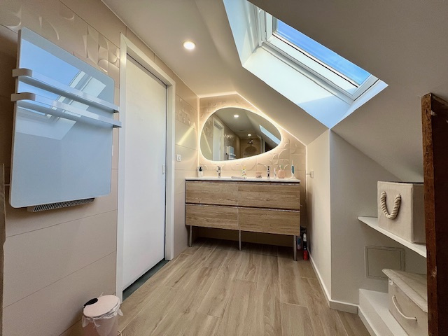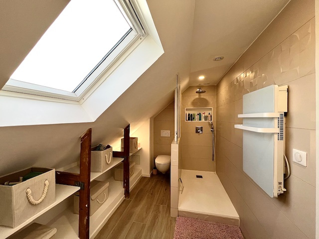 À l'étage, un dégagement dessert 4 chambres avec placards en sous-pente, dont une avec balcon alsacien, ainsi qu'une salle d'eau moderne avec douche à l'italienne et WC.