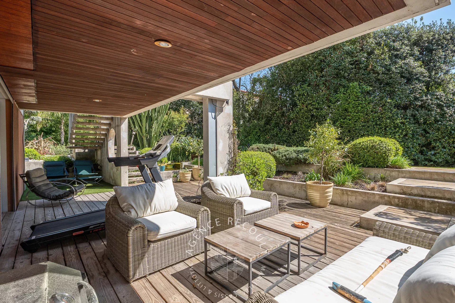 Ce Rez de jardin familial niché dans une résidence sécurisée avec piscine est à proximité de la Mairie de Bagatelle, il s'organise sur deux niveaux autour d'une généreuse pièce de vie de 60 m2: séjour, salle à manger, cuisine US parfaitement équipée et cellier.