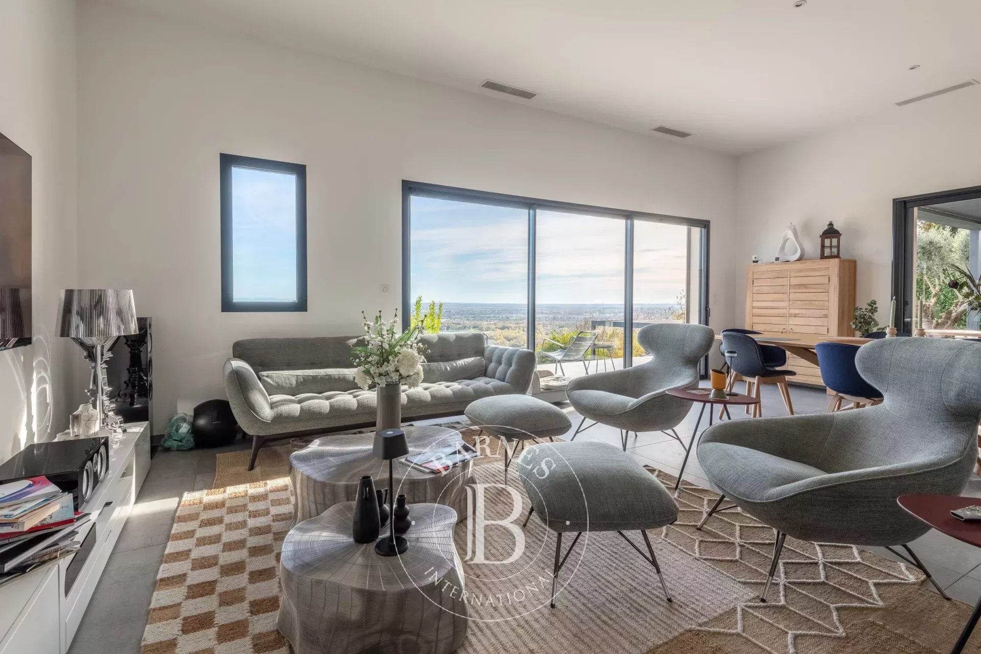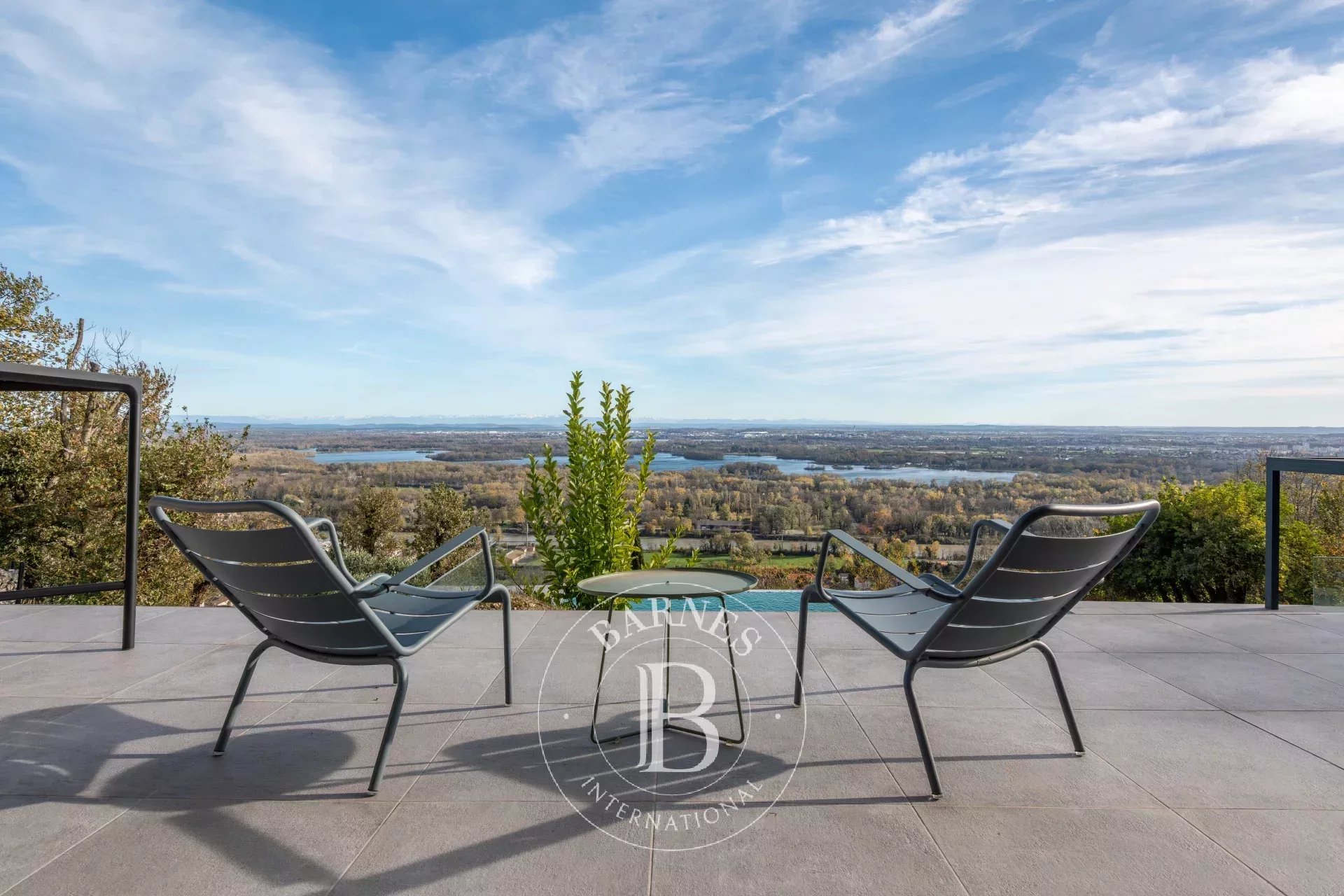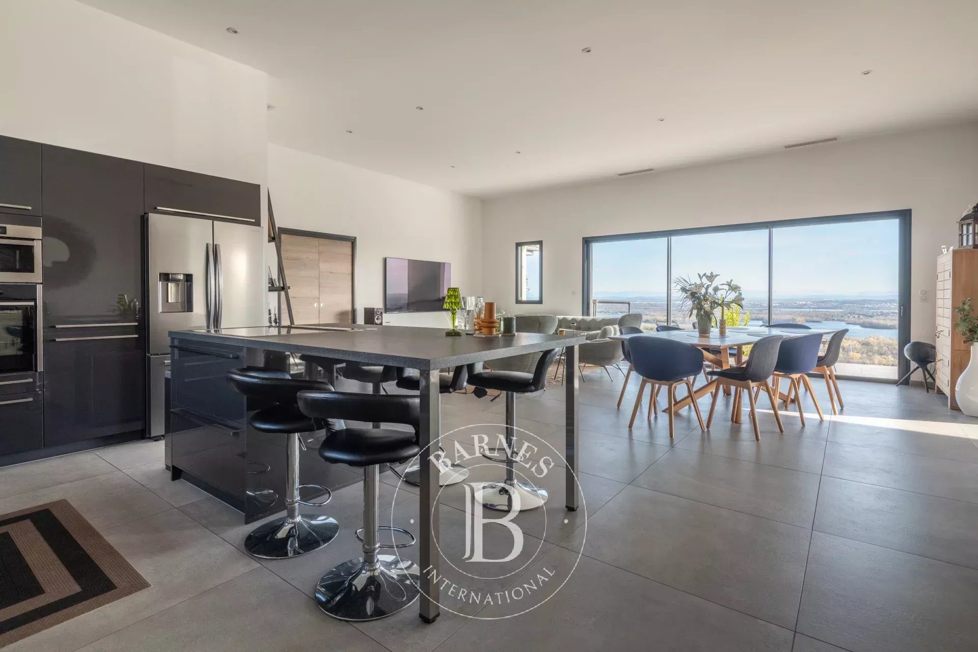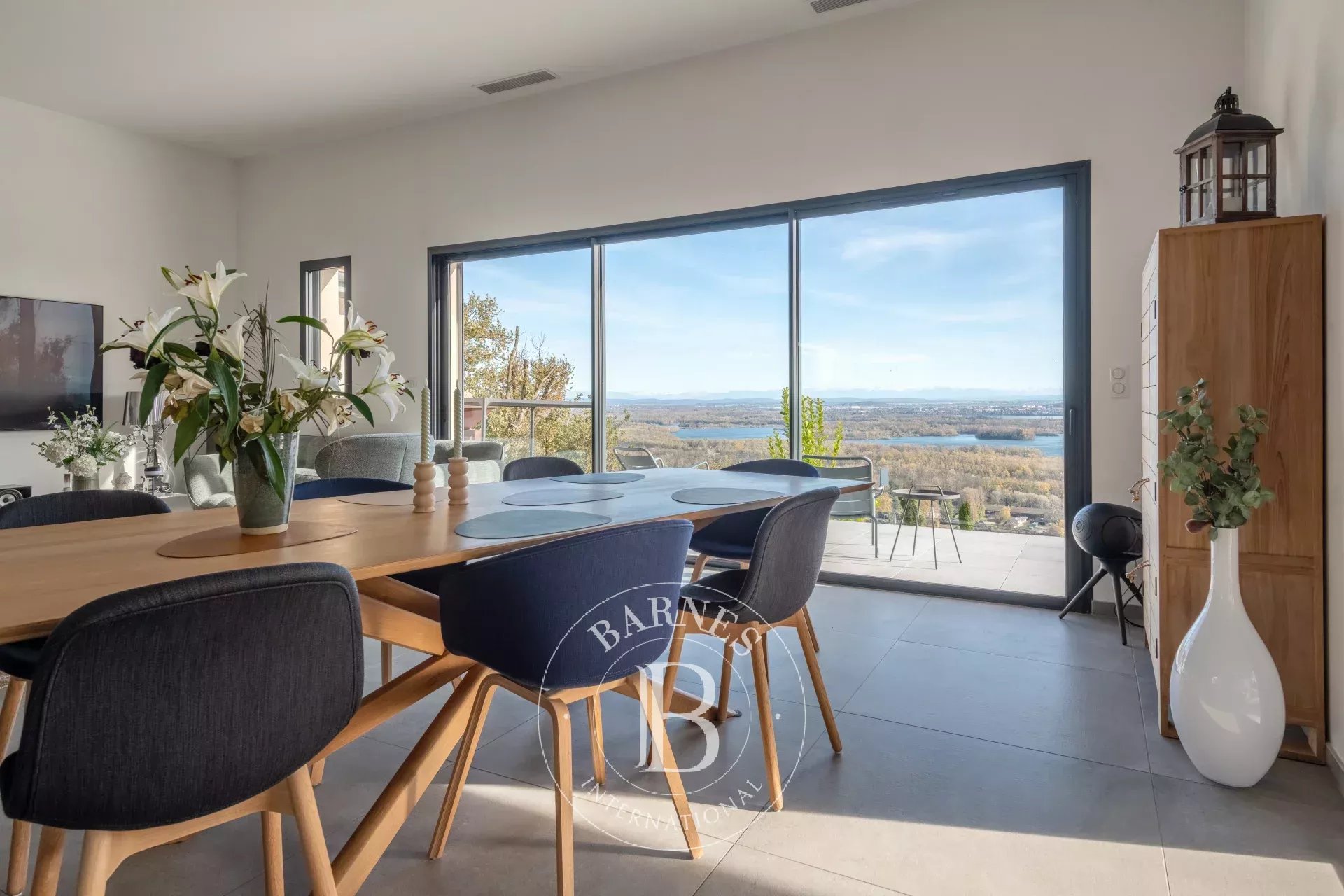Dès l’entrée, le regard est captivé par une vue spectaculaire sur le lac de Miribel et les montagnes environnantes, ainsi que par la lumière naturelle qui inonde la vaste pièce de vie. Celle-ci se compose d’un salon/salle à manger orientée plein sud, d’une cuisine ouverte aménagée et équipée, ainsi que d’un cellier attenant pour plus de praticité.