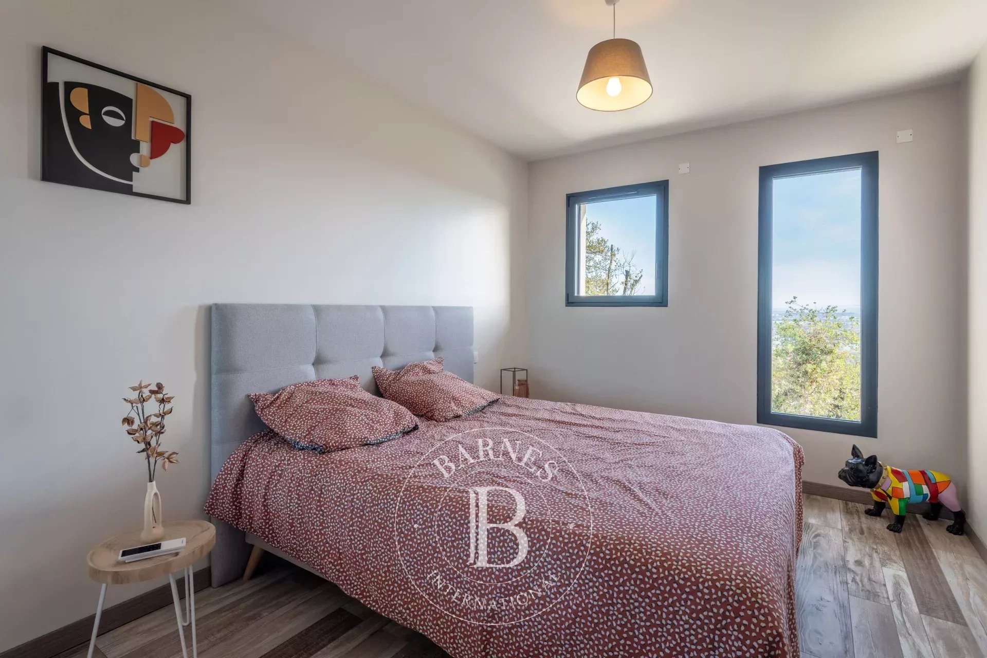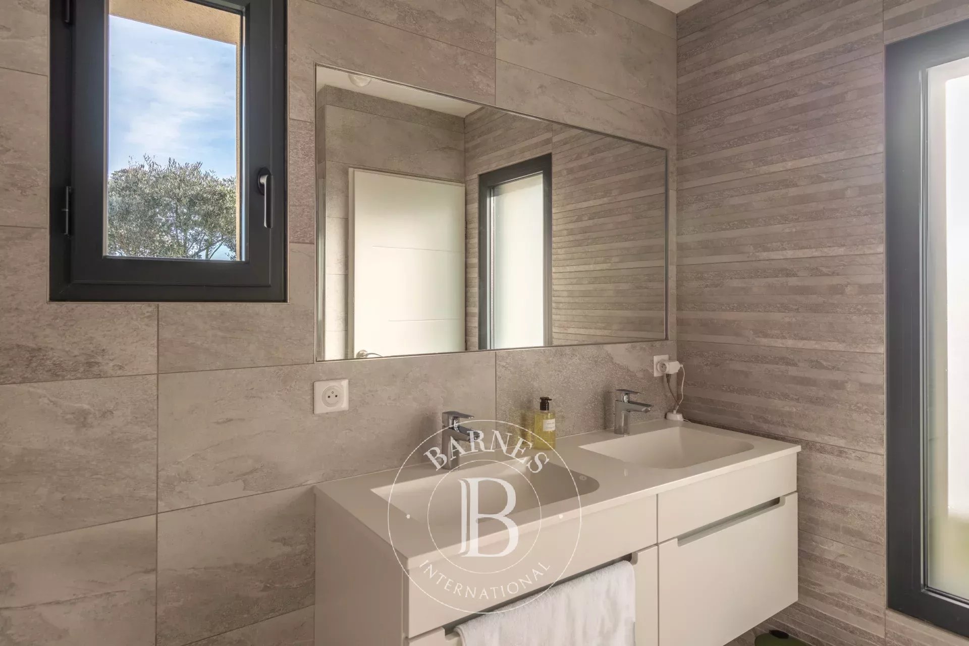 La suite parentale de 25 m² bénéficie de sa propre salle d’eau et d’un dressing sur mesure. Deux autres chambres avec rangements intégrés, un bureau, une salle de bains, une buanderie et un vaste garage double de 60 m² complètent ce niveau principal.