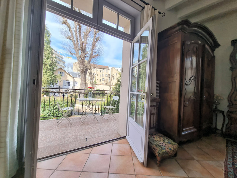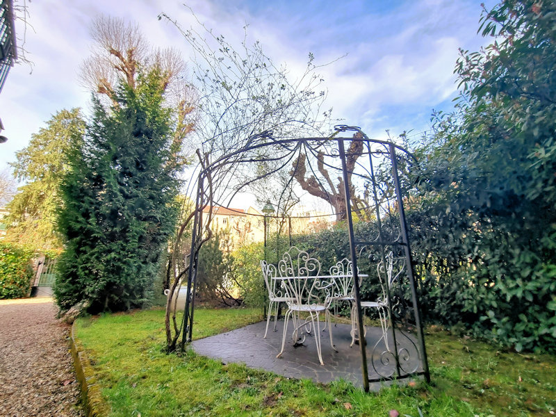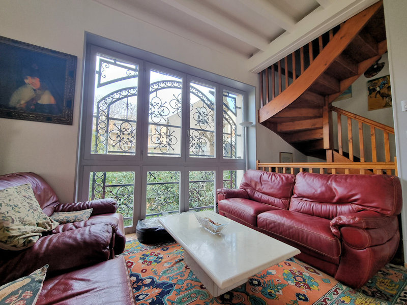 Elle comprend : au rez-de-chaussée hall d'entrée, chambre avec douche et lavabo, WC avec lave-mains, buanderie/chaufferie, cave. Au premier étage : cuisine équipée et espace dinatoire, superbe pièce à vivre (triple exposition) de 48 m2 avec verrière ornée de ferronneries d'art, plafonds à la française, porte-fenêtre ouvrant sur balcon-terrasse avec vue sur les jardins de la résidence et les parcs de la ville.