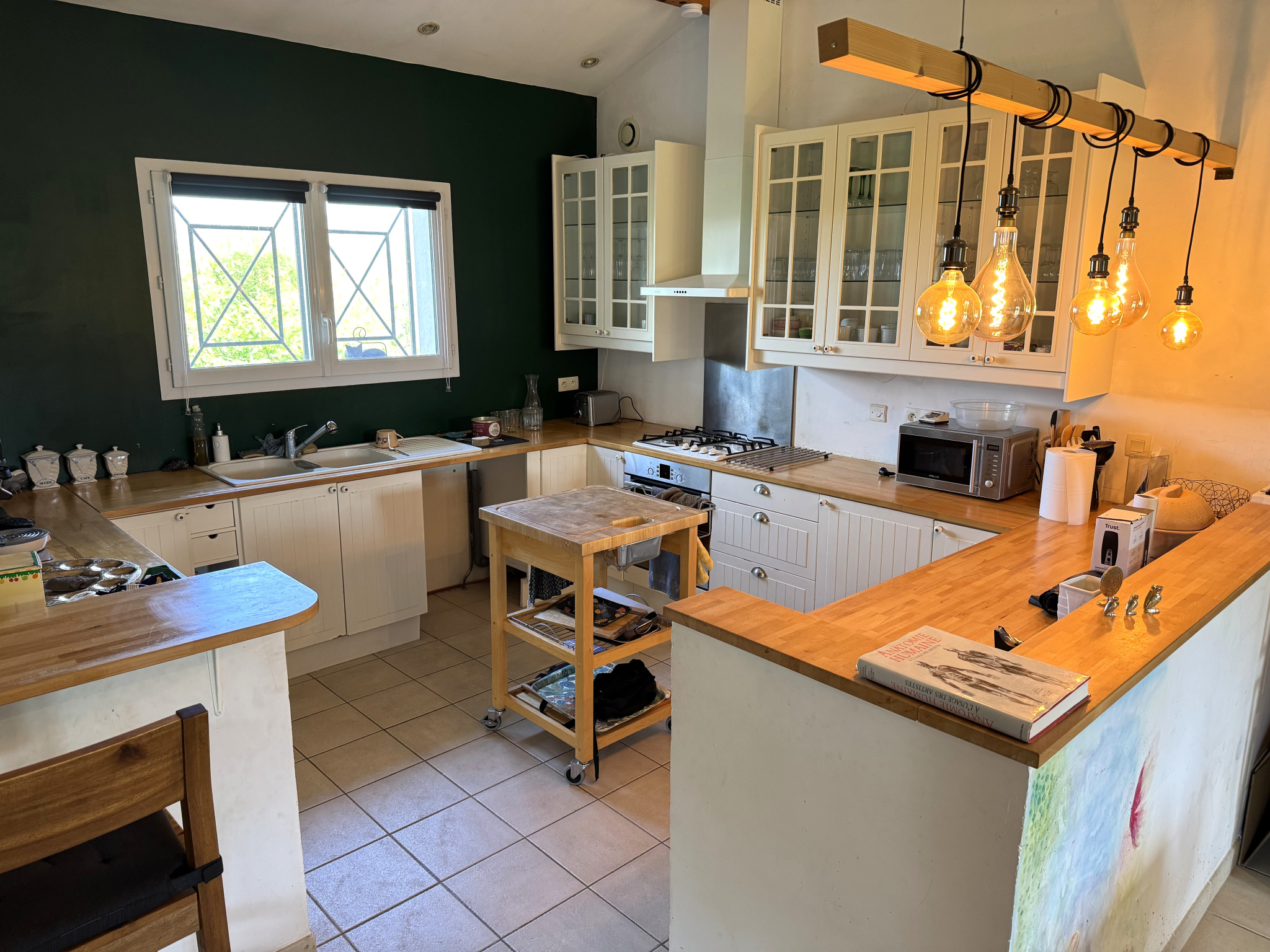 En rez-de-jardin, l'entrée de la maison dessert un grand salon séjour de plus de 55 m2 env. avec une cuisine ouverte aménagée.