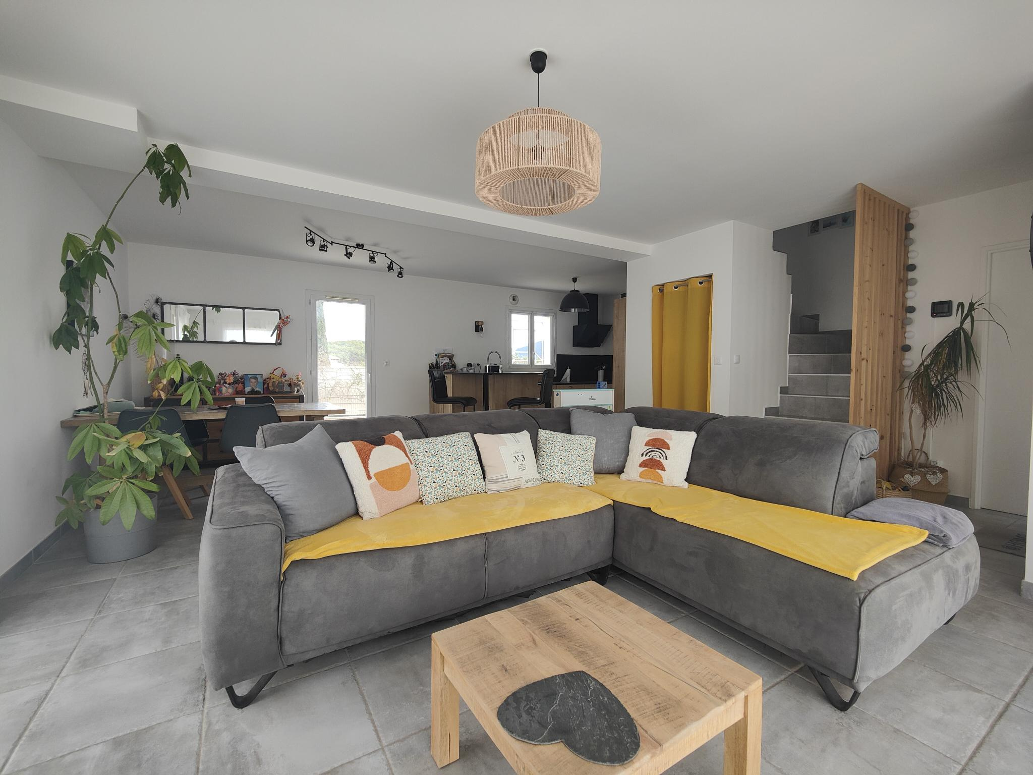 Au rez-de-chaussée, elle offre une entrée, un agréable salon/séjour baigné de lumière ouvrant sur une spacieuse terrasse, une cuisine ouverte fonctionnelle avec accès direct au garage, ainsi qu'un WC indépendant.