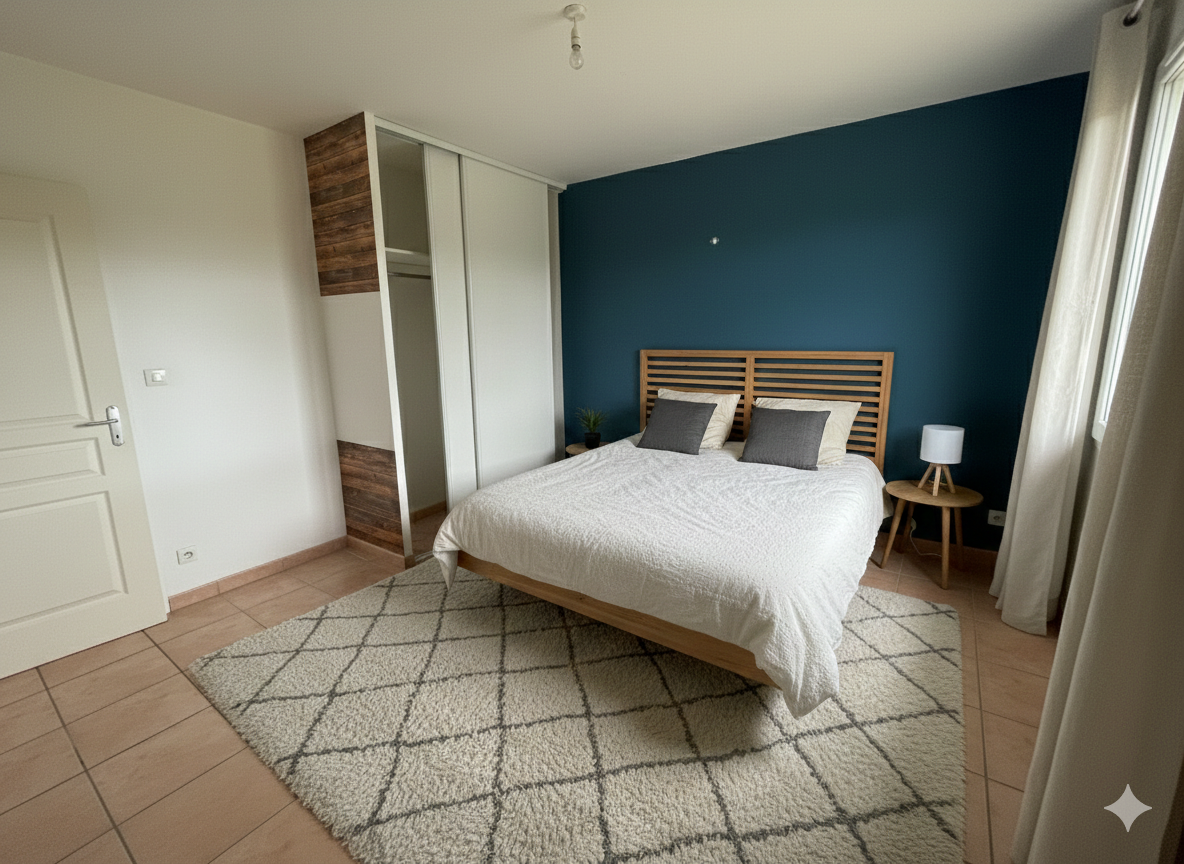 À l'étage, l'espace nuit se compose de trois chambres lumineuses, dont deux sont équipées de placards.