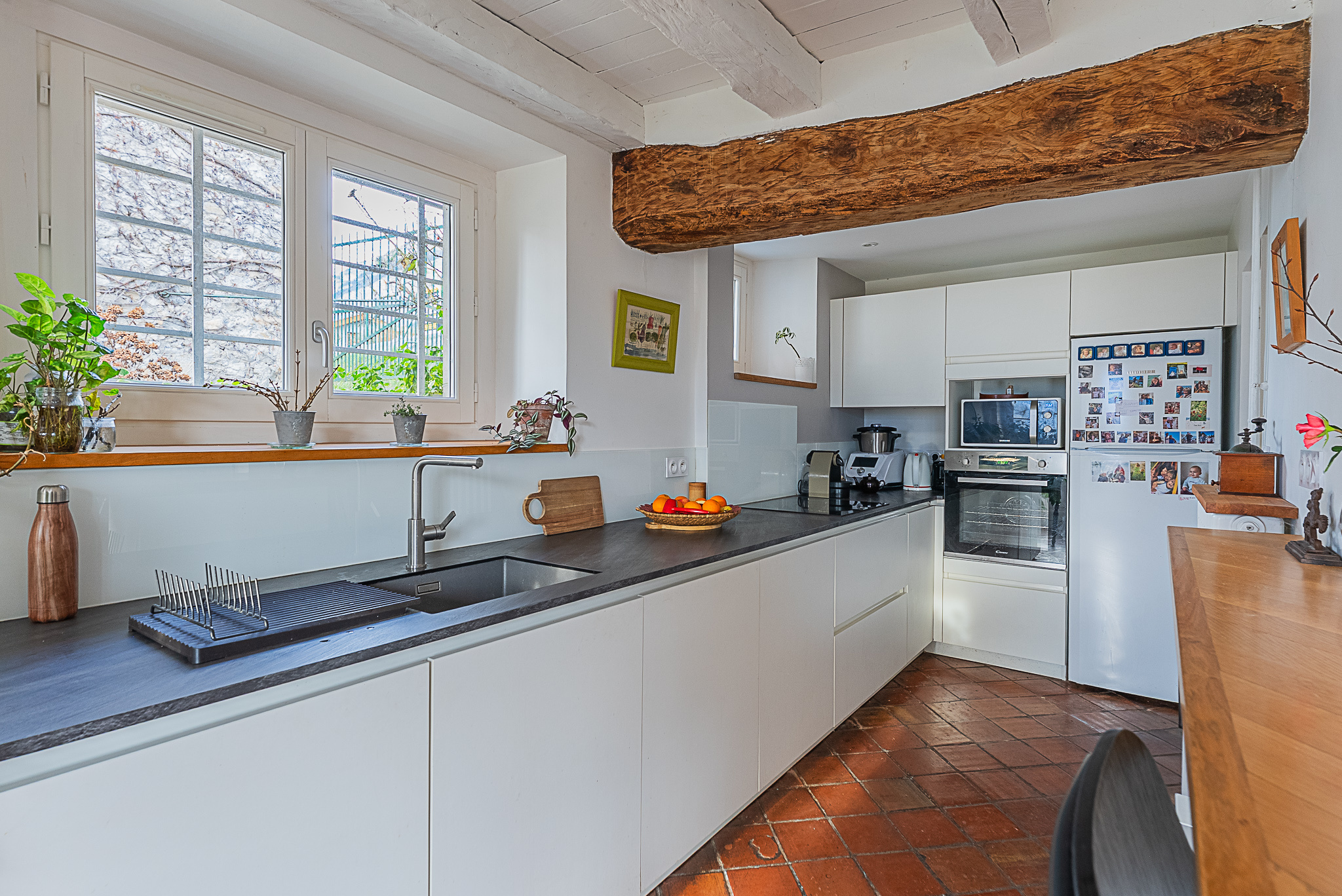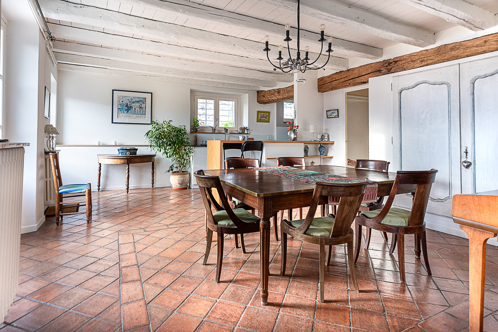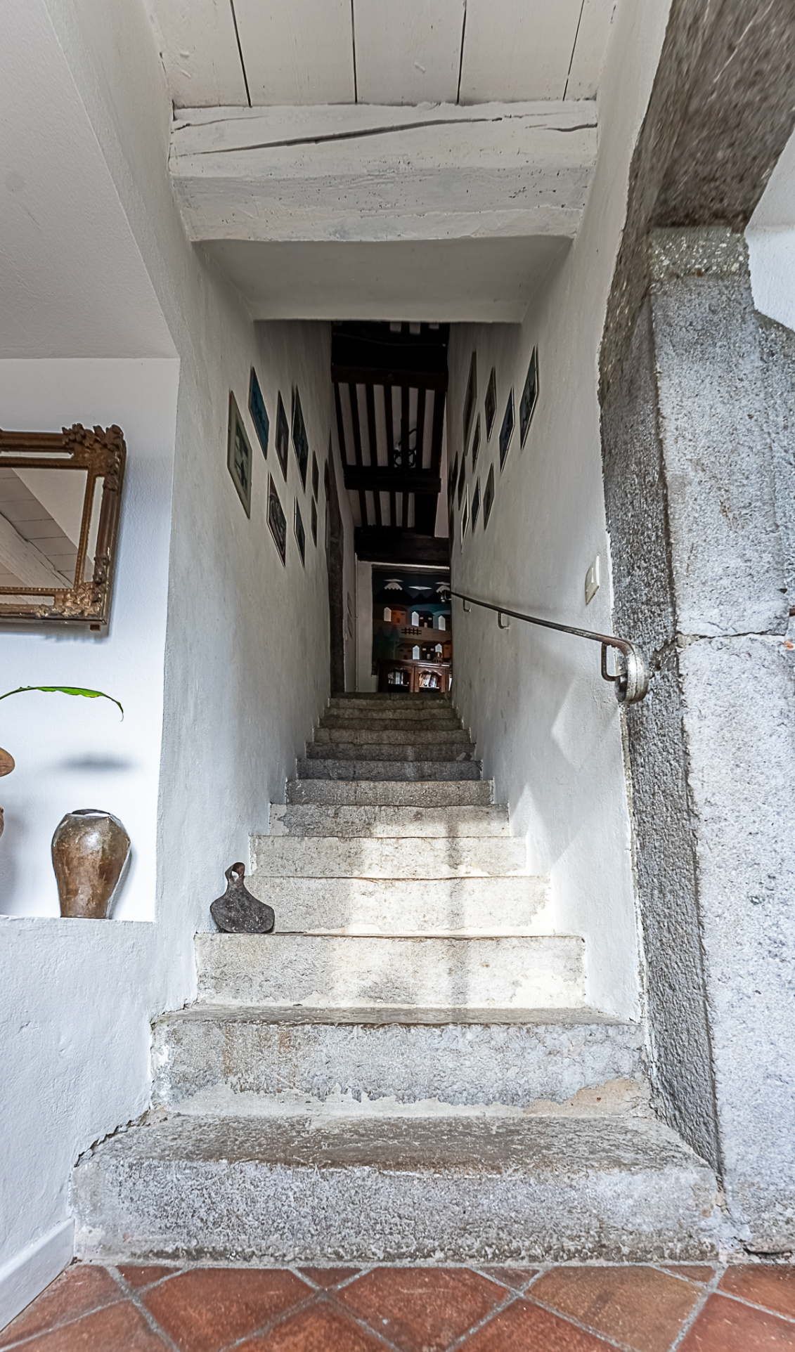 De plain pied avec un accès direct au terrain on trouve une cuisine équipée avec salle à manger et un séjour avec cheminée. Cachés derrière un bel escalier en pierre on trouve des WC avec lave-mains, un cellier et la chaudière à gaz.