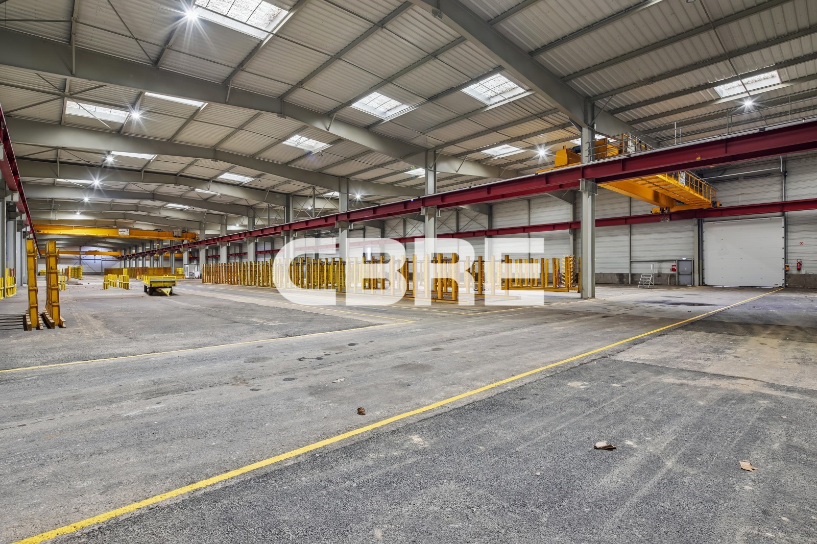 À l'intérieur, les halls présentent des volumes importants avec une belle hauteur libre, une structure métallique et de larges travées dégagées. L'éclairage naturel est assuré par des bandes zénithales continues en toiture, complété par un réseau d'éclairage industriel. Le sol alternant béton et enrobé est adapté aux mouvements réguliers d'engins et aux charges importantes. L'ensemble du bâtiment est équipé de solutions de levage dimensionnées pour des manutentions lourdes, avec des chemins de roulement couvrant les travées principales et des ponts roulants pouvant atteindre une capacité allant jusqu'à 20 tonnes.
