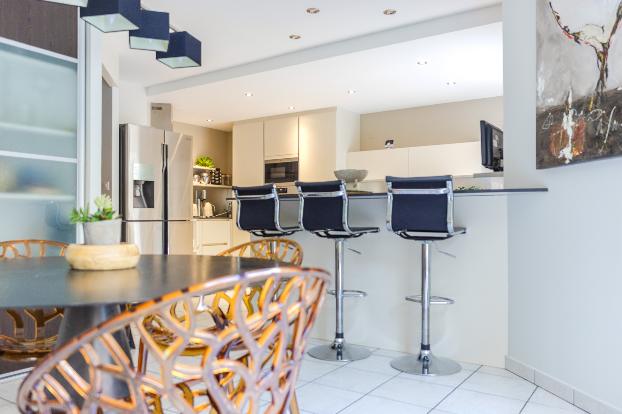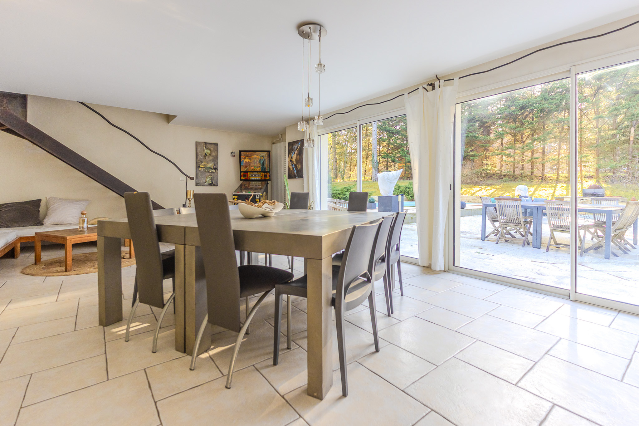 Grande cuisine équipée , salon , salle à manger avec salle de réception de 50m2 donnant sur une terrasse de 190m2 avec piscine , belle suite parentale + cinq chambres et un bureau.