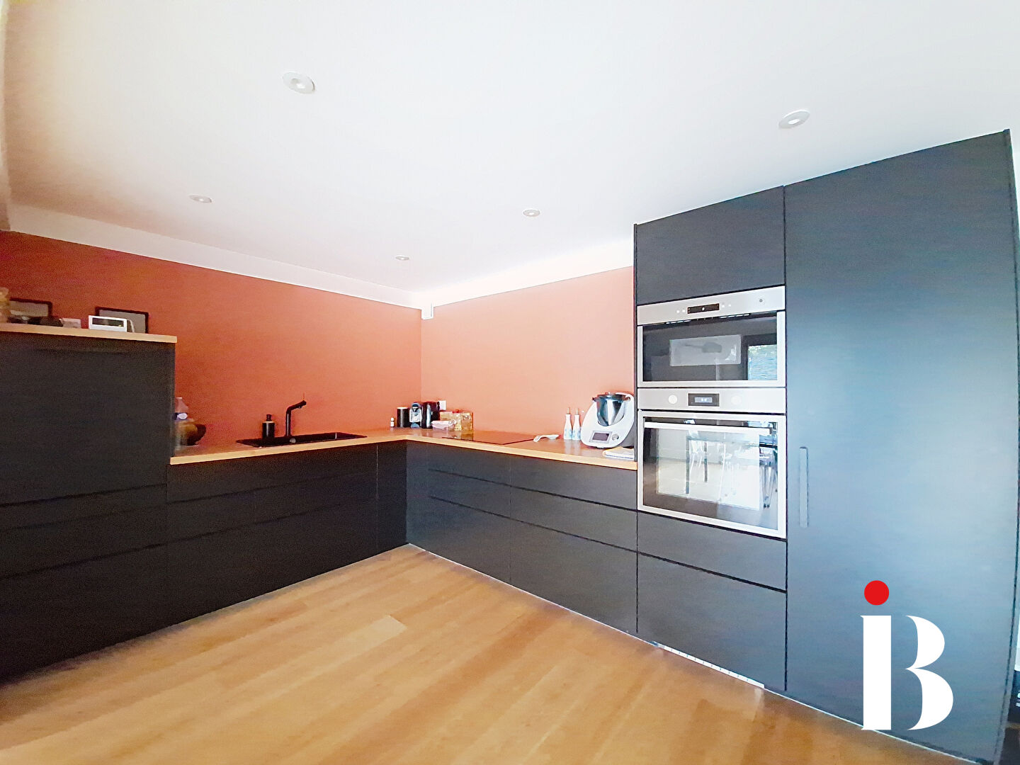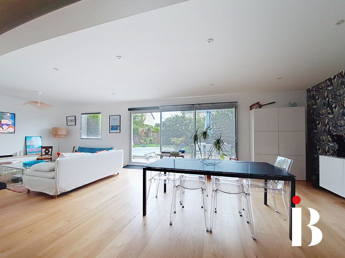 La cuisine aménagée et équipée, ouverte sur une vaste pièce de vie lumineuse, s'ouvre grâce à de grandes baies vitrées sur un magnifique jardin paysagé avec piscine chauffée, véritable havre de paix.