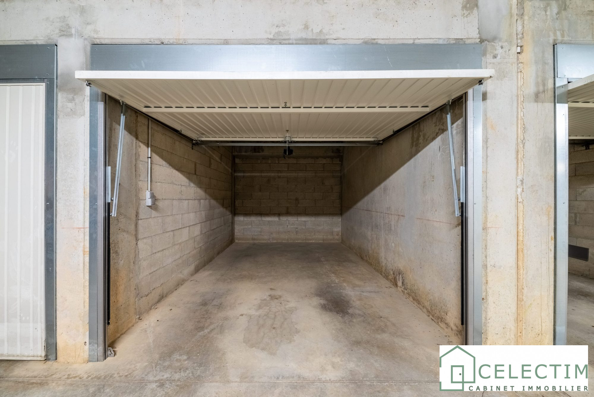 Un garage fermé de 14 m², avec porte motorisée, électricité et prise intérieure, complète ce bien.