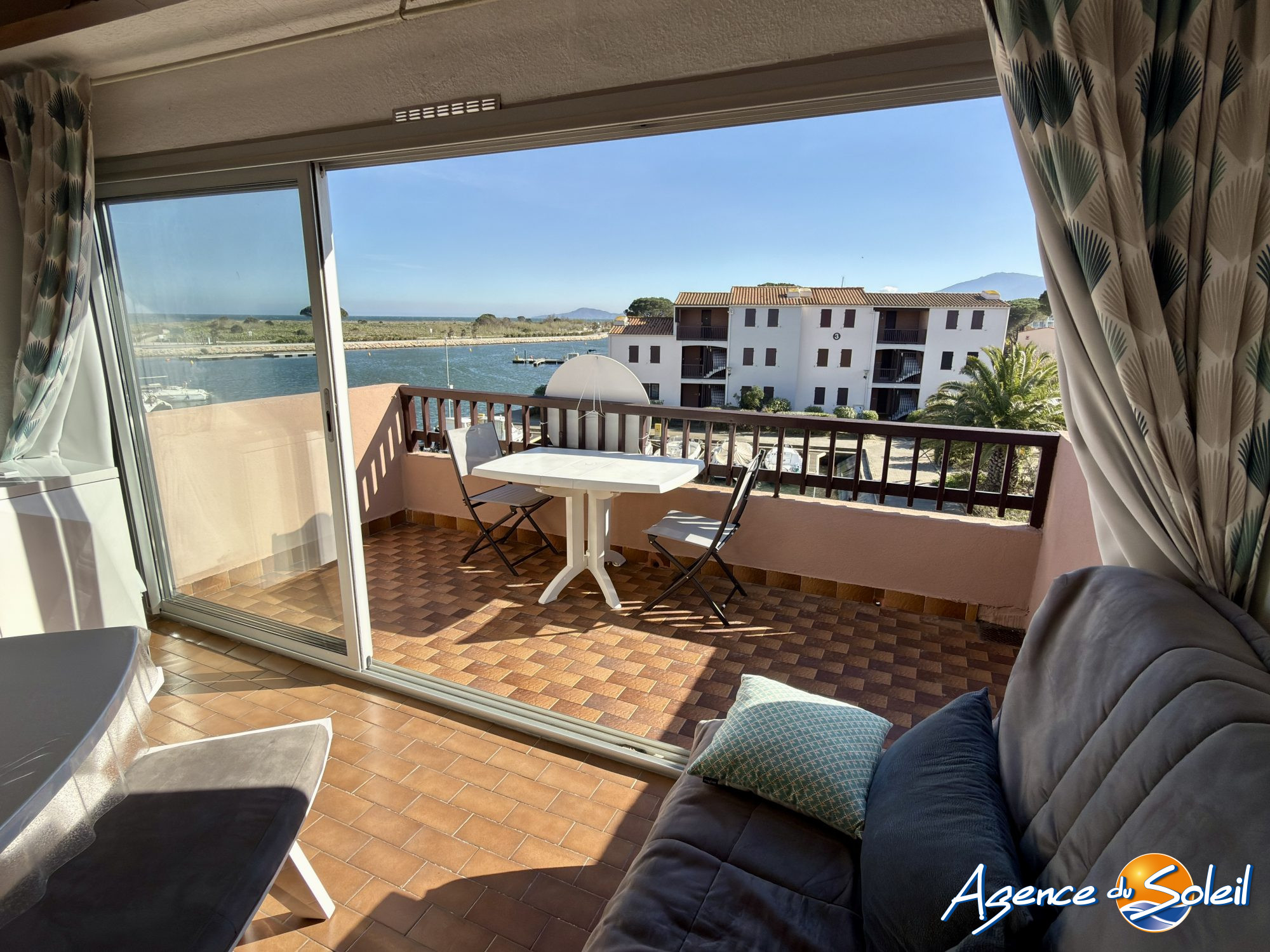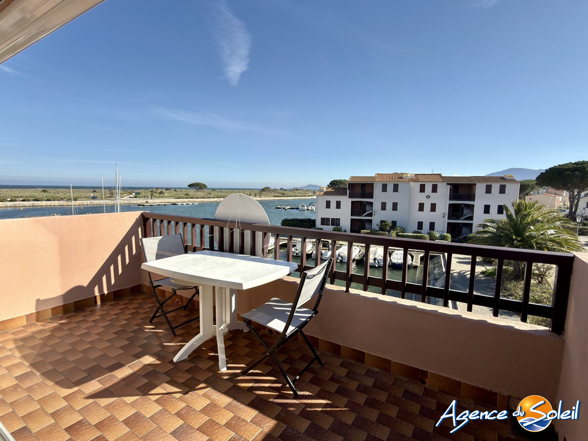 La pièce de vie s'ouvre sur une superbe terrasse de 8 m² exposée plein Sud, équipée d'un store-banne électrique, bénéficiant d'une vue panoramique sur la Marina et la Mer.